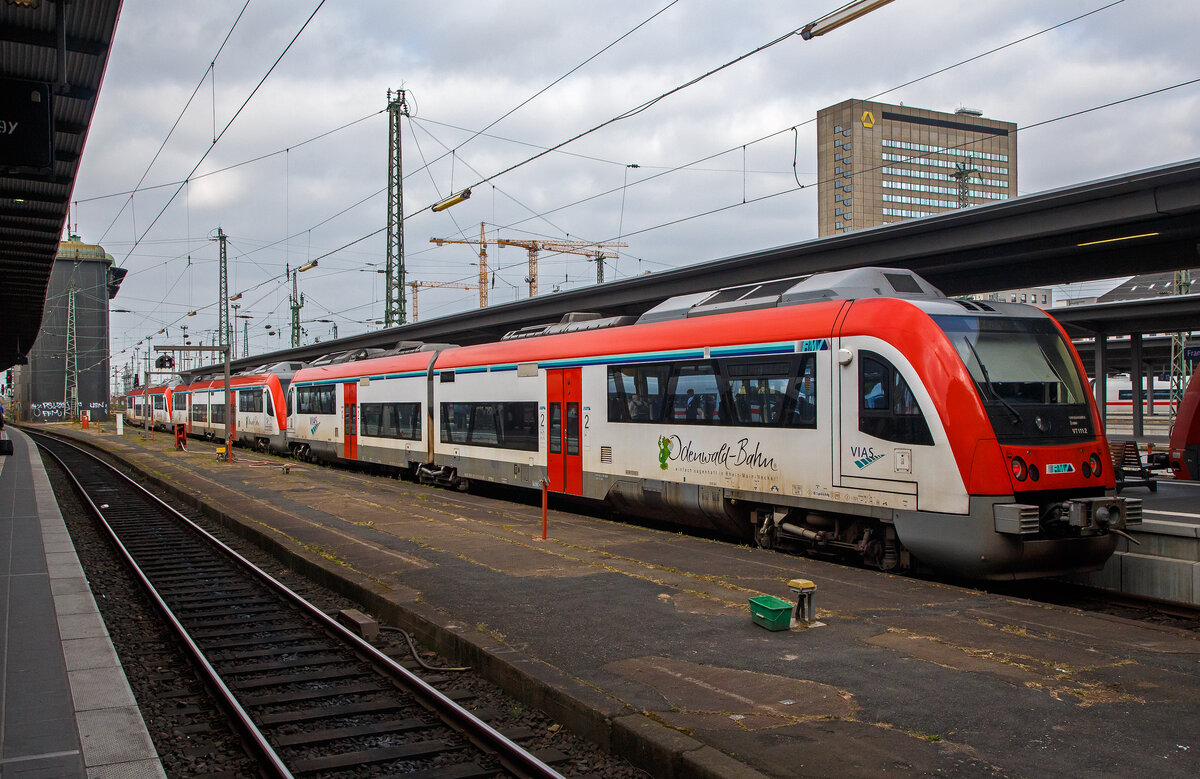 Drei gekuppelte Bombardier Itino (Dieseltriebwagen der BR 615) der VIAS - Odenwaldbahn verlassen am 18.05.2018 den Hauptbahnhof Fankfurt am Main.