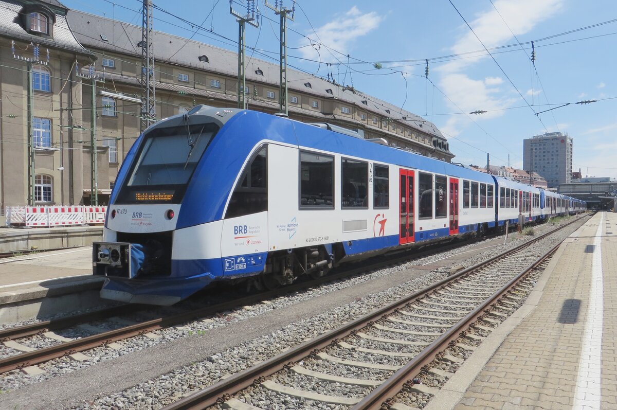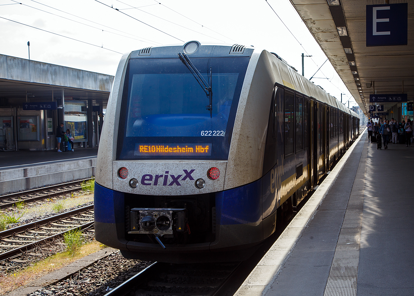 Zwei gekuppelte LINT 54 der VIAS Rail GmbH stehen am 21.03.2023 im Hauptbahnhof Frankfurt am Main, als RE 85 „Odenwaldbahn“ nach Babenhausen, zur Abfahrt bereit. Hier im Vordergrund (als Zugschluss) der VT 222 (95 80 0622 378-7 D-VIASR /95 80 0622 878-6 D-VIASR).