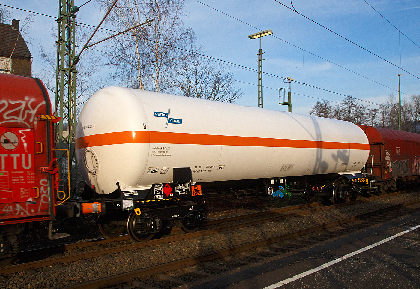 Vierachsiger Drehgestell 95 m³ Druckgas-Kesselwagen ohne Sonnenschutzdach, 33 80 7918 308-7 D-ARETZ, der Gattung Zagkks, der ARETZ GmbH & Co. Kesselwagen KG (Krefeld), laut Anschrift und Gefahrgut-Warntafel (23/1965) beladen mit Kohlenwasserstoffgas, Gemisch, verflüssigt, n.a.g. (Gemisch C) am 17 Juli 2025 im Zugverband bei einer Zugdurchfahrt in Kirchen (Sieg) in Richtung Köln.