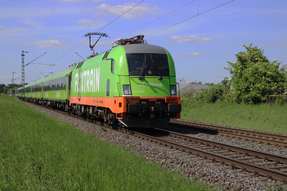 Am 8 Mai 2025 passiert Flixtrain 242.503 der auf dem offenbarer Weg stehender Fotograf bei Kaarst (zwischen Krefeld und Neuss).