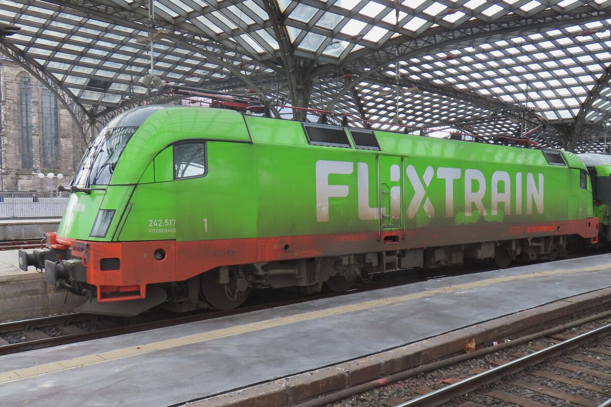 Die an die FlixTrain GmbH (München) vermietete SIEMENS Vectron AC 193 437 (91 80 6193 437-1 D-ELOC) der ELL - European Locomotive Leasing (Wien) fährt am 18 Juni 2025 mit dem FlixTrain FLX 1233 (Köln Hbf nach Berlin Hbf) in den Hauptbahnhof Köln ein. Die Vectron AC wurde 2023von Siemens Mobilitiy in München-Allach unter der Fabriknummer 23571 gebaut und an die ELL geliefert. Diese Vectron Lokomotive ist als AC – Lokomotive (Wechselstrom-Variante) mit 6.400 kW Leistung und für eine Höchstgeschwindigkeit von 200 km/h konzipiert. Sie wurde in der Vectron Variante AC B14 ausgeführt und hat so die Zulassungen für Deutschland, Österreich, Ungarn, Tschechien, Slowakei, Rumänien und Bulgarien (D / A / H / CZ / SK / RO / BG). So besitzt die Variante AC B14 folgende Zugsicherungssysteme: ETCS BaseLine 3, sowie für Deutschland (PZB90 / LZB80 (CIR-ELKE I)) Österreich (ETCS Level 1 mit Euroloop, ETCS Level 2, PZB90 / LZB80) Ungarn (ETCS Level 1, EVM (Mirel)) Tschechien und Slowakei (LS (Mirel)) Rumänien und Bulgarien (PZB90)