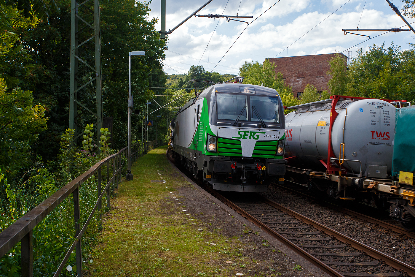 Da bin ich noch mit dem einem Güterzug beschäftigt, da kommt schon ein Gegenzug. Die sehr neue an die SETG - Salzburger Eisenbahn TransportLogistik GmbH vermietete SIEMENS Vectron MS 7193 104 „Der Fuchs“ (91 80 7193 104-5 D-ATLU) der Alpha Trains Belgium N.V. fährt am 21 August 2025 mit einem Kalkzug (Wagen der Gattung Tads) durch den Bahnhof Scheuerfeld/Sieg in Richtung Siegen.