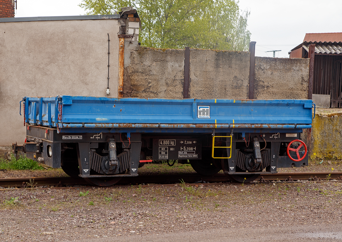 Der vierachsige Drehgestell-Schienenwagen (Drehgestell-Flachwagen) DR Köln 918 041 SSlma (DB SSlma 44), beladen mit Kessel und Teilen einer Dampflok, am 17 April 2023 im DDM - Deutsches Dampflokomotiv-Museum in Neuenmarkt (aufgenommen aus einem Zug heraus).
