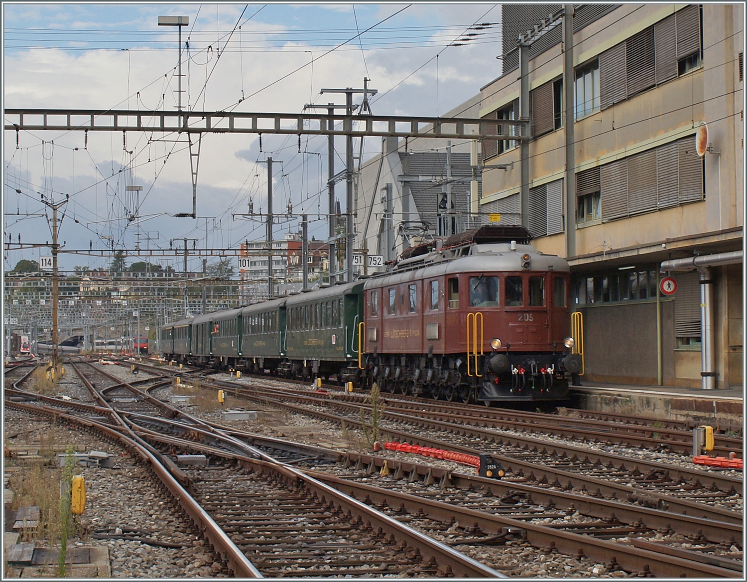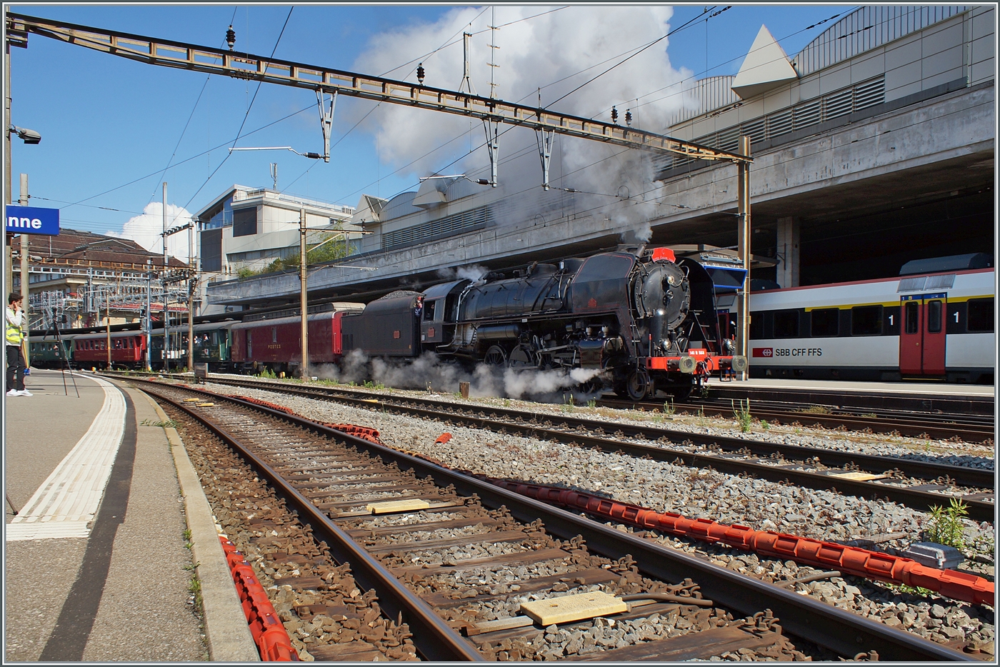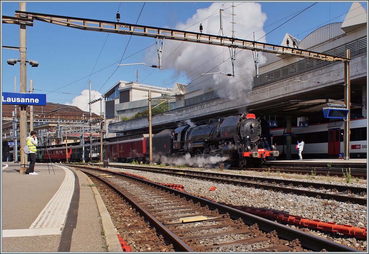 Das Bild zeigt die (ex) SNCF 141R568 nach der Ankunft in Lausanne. Der stattliche Zug bestand aus 40 Achsen Anhängelast. Zudem krönte die "Schieblok" in Form der Ae 4/4 251 (BLS) den gelungen Auftritt in Lausanne.