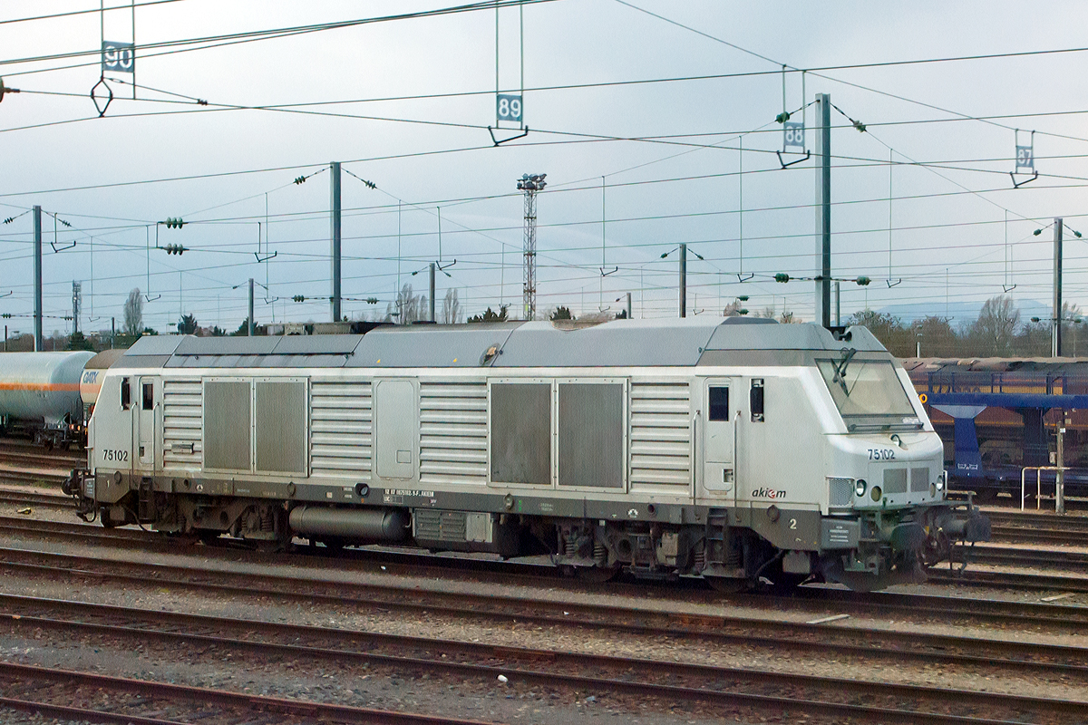 ie Akiem 75102 (92 87 0075 102-9 F-AKIEM) ist am 24.03.2015 bei Muhlhouse (Mülhausen) abgestellt. Die Aufnahme konnte ich aus einem Zug heraus machen.