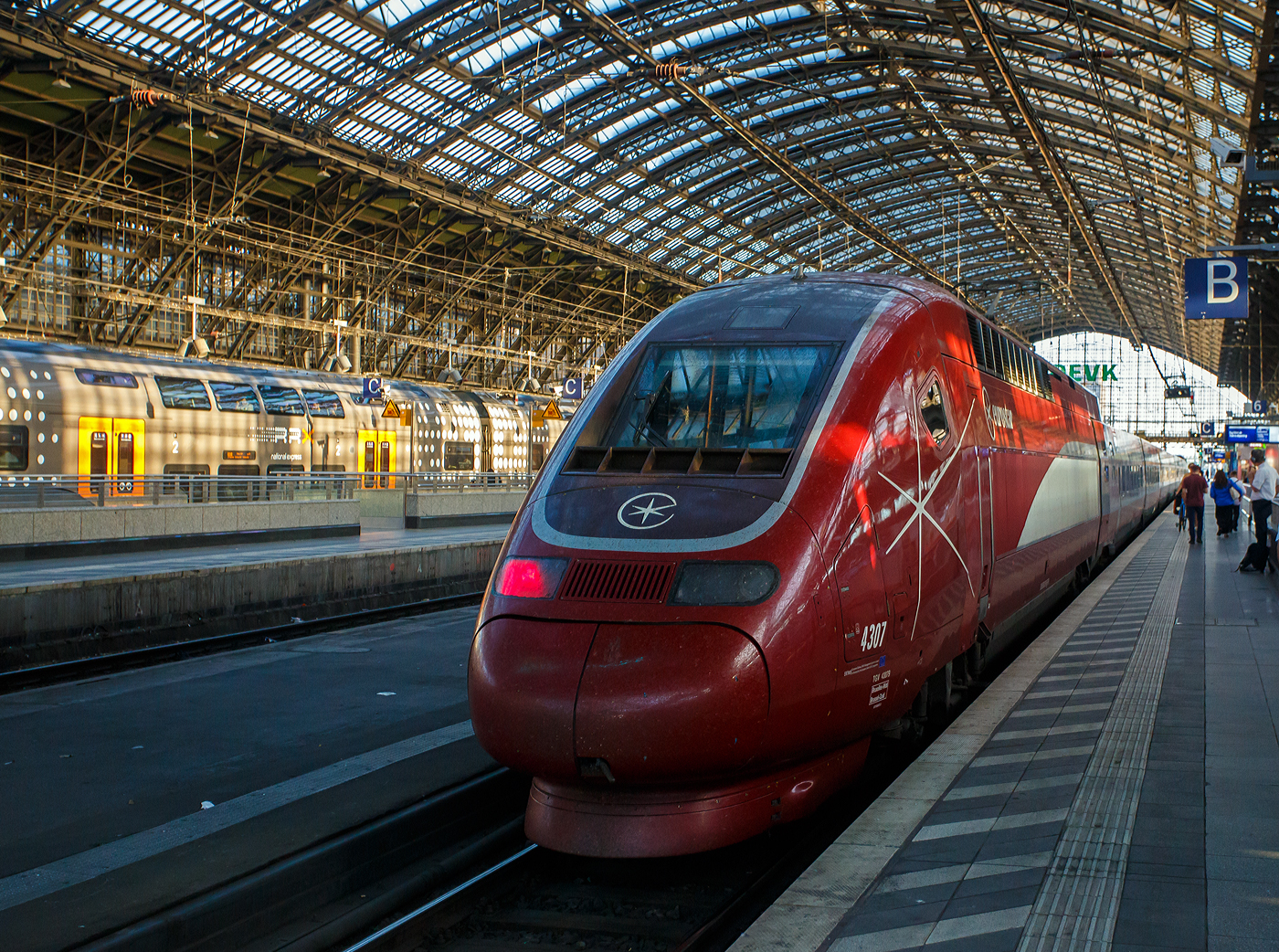 Zwei Thalys PBKA Tz 4346 und Tz 4342 stehen am 01.08.2007 in Paris Gare du Nord zur Abfahrt bereit. Die Hochgeschwindigkeitszüge Thalys PBKA verbinden die Städte Paris, Brüssel, Köln und Amsterdam. Für diesen länderübergreifenden Verkehr sind sie mehrsystemfähig.