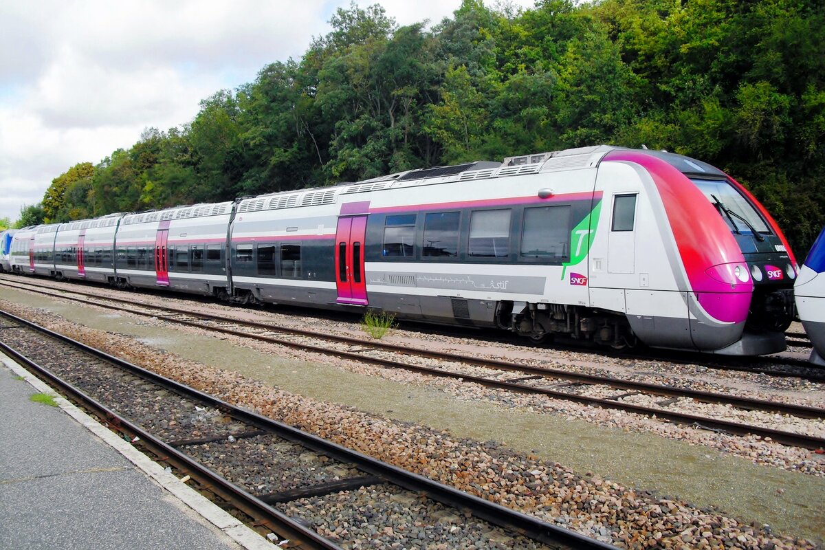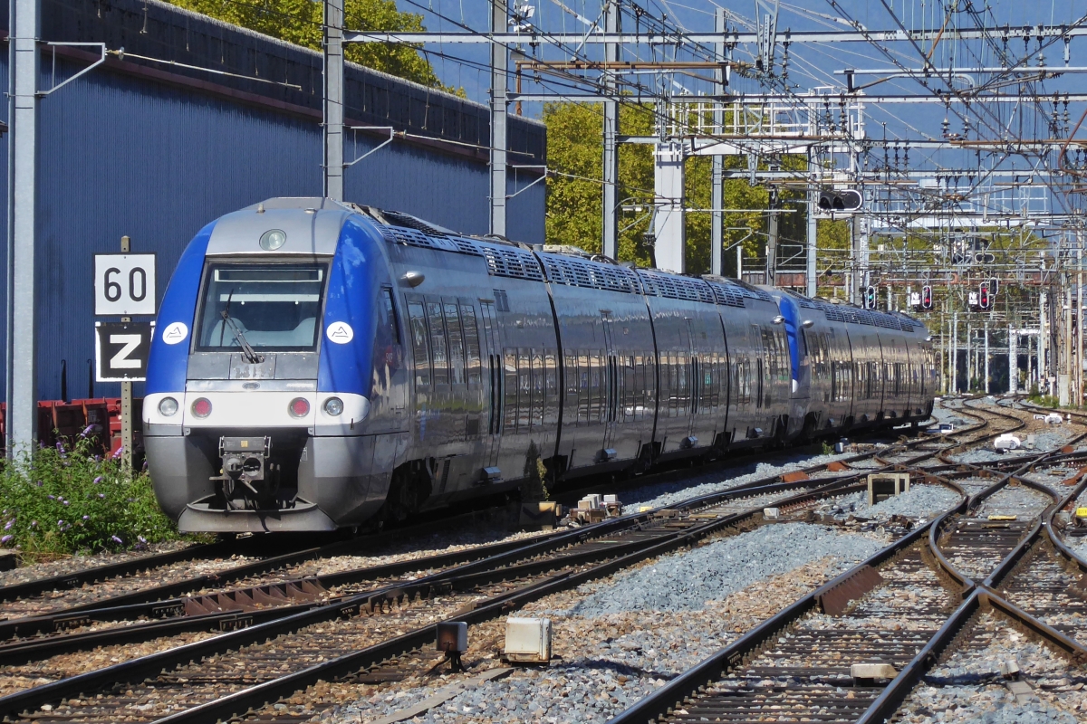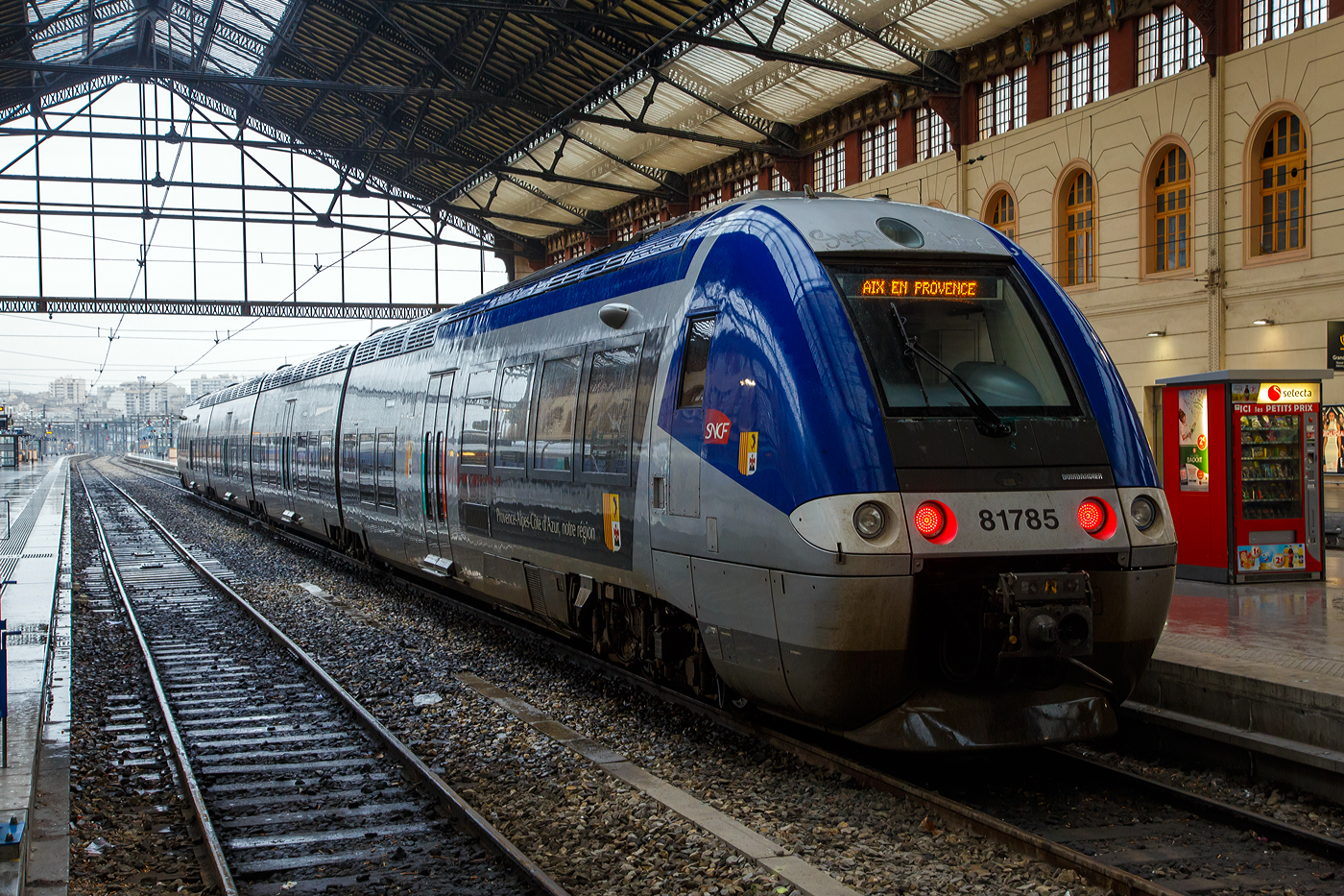Unter der markanten Bahnhofshalle von Lyon Perrache mit dem passenden Turm im rechten Bildteil verlässt der SNCF 82621 verlässt den Bahnhof Richtung Bourg-en-Bresse, während im Hintergrund der FS Trenitalia ETR 400 031 als FR 6654 (ab 13:11) nach Paris Gare de Lyon (an 15:30) auf die Abfahrt wartet.