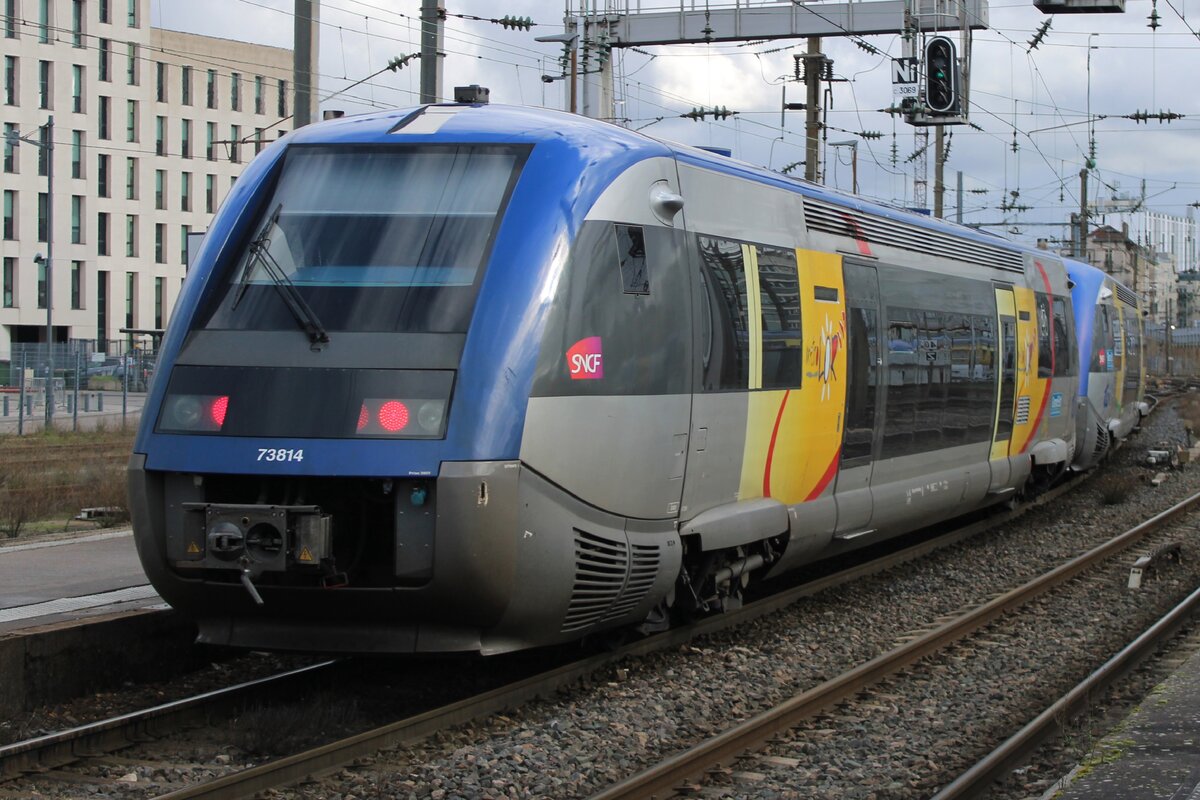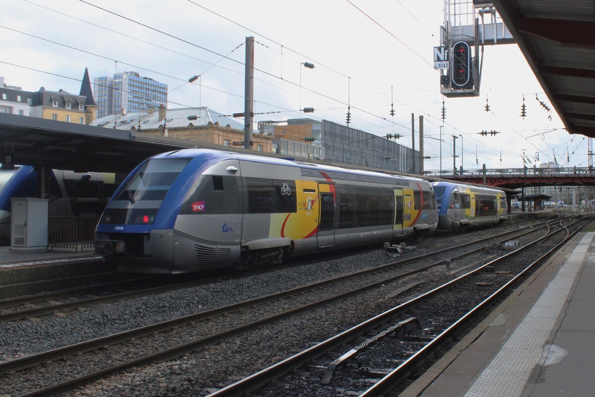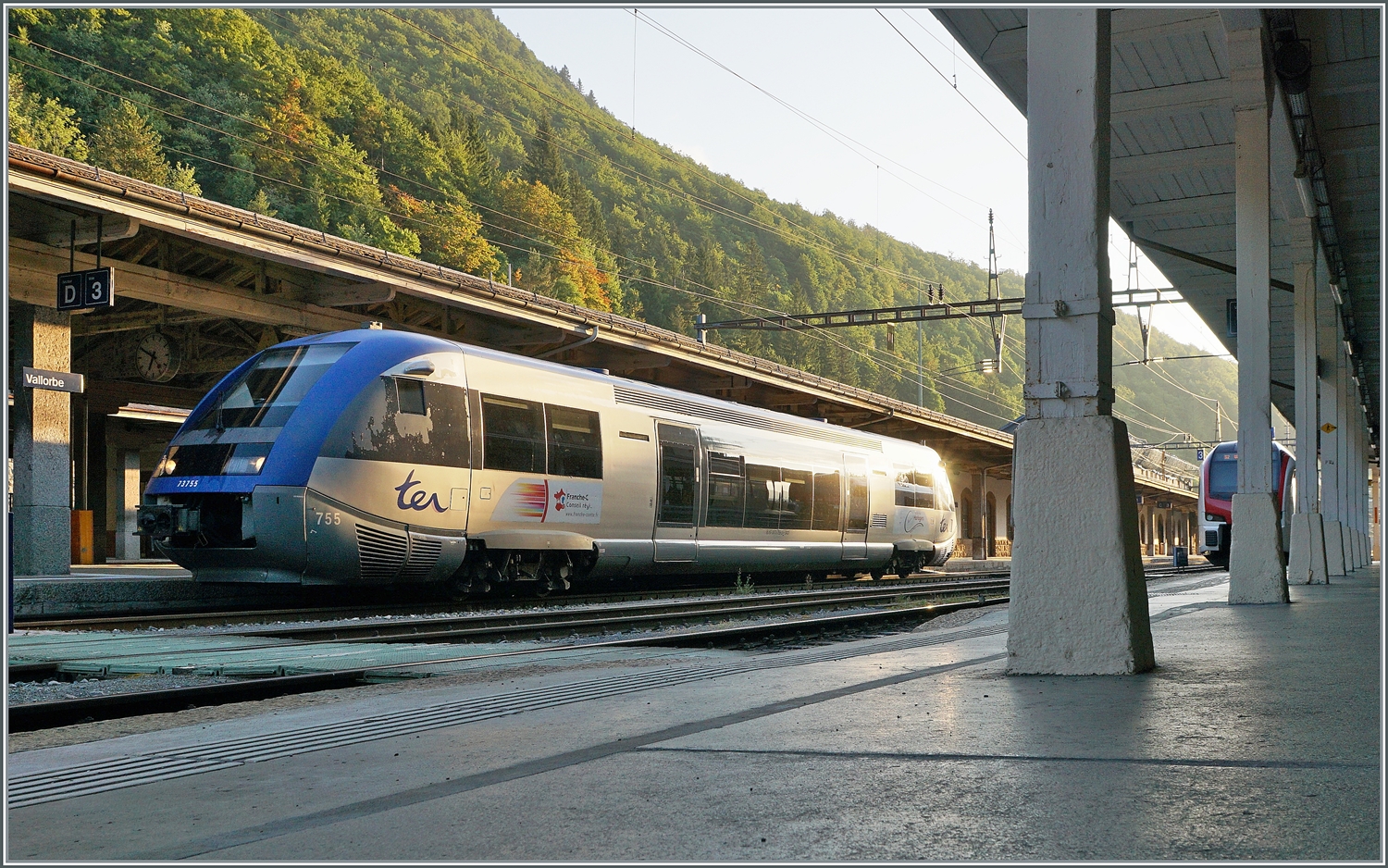 Auf dem Weg von Meroux nach Porrentury konnte ich beim zwei Minuten Aufenthalt in Delle den hier stehenden SNCF X73757 fotografieren. Somit kommen auf der nun elektrifizierten Strecke Delle - Belfort auch (wieder) Diesel Fahrzeuge zum Einsatz. Der SNCF X 73757 "Baleine" ist als MOBIGO TER 895005 von Belfort um 8:19 in Delle angekommen und wird als MOBIGO TER 895004 um 14:41 nach Belfort zurückfahren.