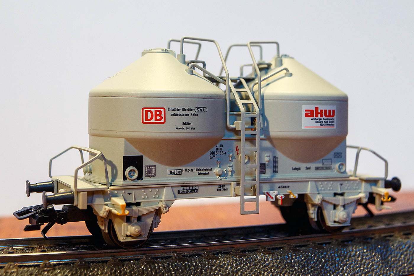 Detailbild von dem vierachsigen 80m³ Silowaggon bzw. Drehgestell-Staubgutwagen für SO 143 – Aluminiumoxid 33 80 9326 673-6 D-ERMD, der Gattung Uacs (Type 6924 B0), französischen Vermietungsfirma ERMEWA S.A., im Zugverband am 14.02.2023 bei der Zugdurchfahrt in Niederschelden (Sieg).