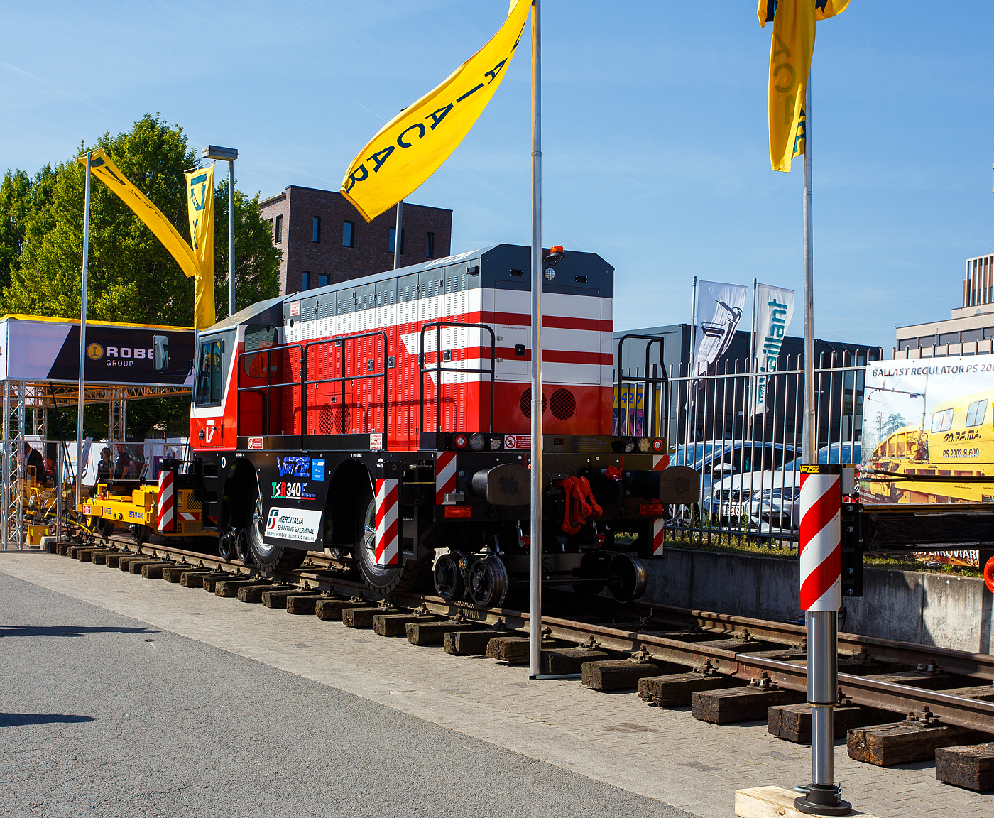 Die italienische VAIA CAR S.p.A. mit Sitz in Calvisano bei Brescia präsentierte auf der 29. Internationale Ausstellung Fahrwegtechnik 2025 (iaf) in Münster (hier am 20 Mai 2025) das Zweiwege-Schienenschweiß-Fahrzeug vom Typ Spark-Rail (als voll elektrischer Version), mit Schweißkopf vom Typ KUBE K355 (von VAIA CAR entworfen und patentiert).