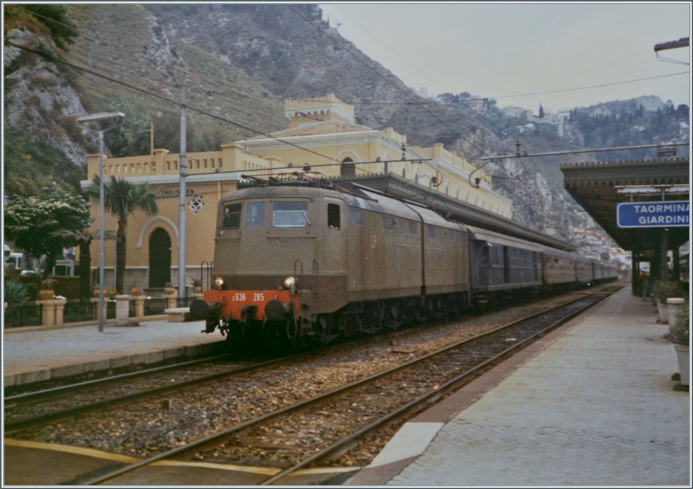 So nah habe ich bei unserer Reise den wunderschönen Bahnhof von Taormina-Giardini lieder nicht gesehen. Doch ein weiter Blick übers Meer vom Schiff aus und ein kurzer bei der Vorbeifahrt im Linienbus lassen doch die berechtige Vermutung aufkommen, dass sich da nichts bis wenig geändert hat.