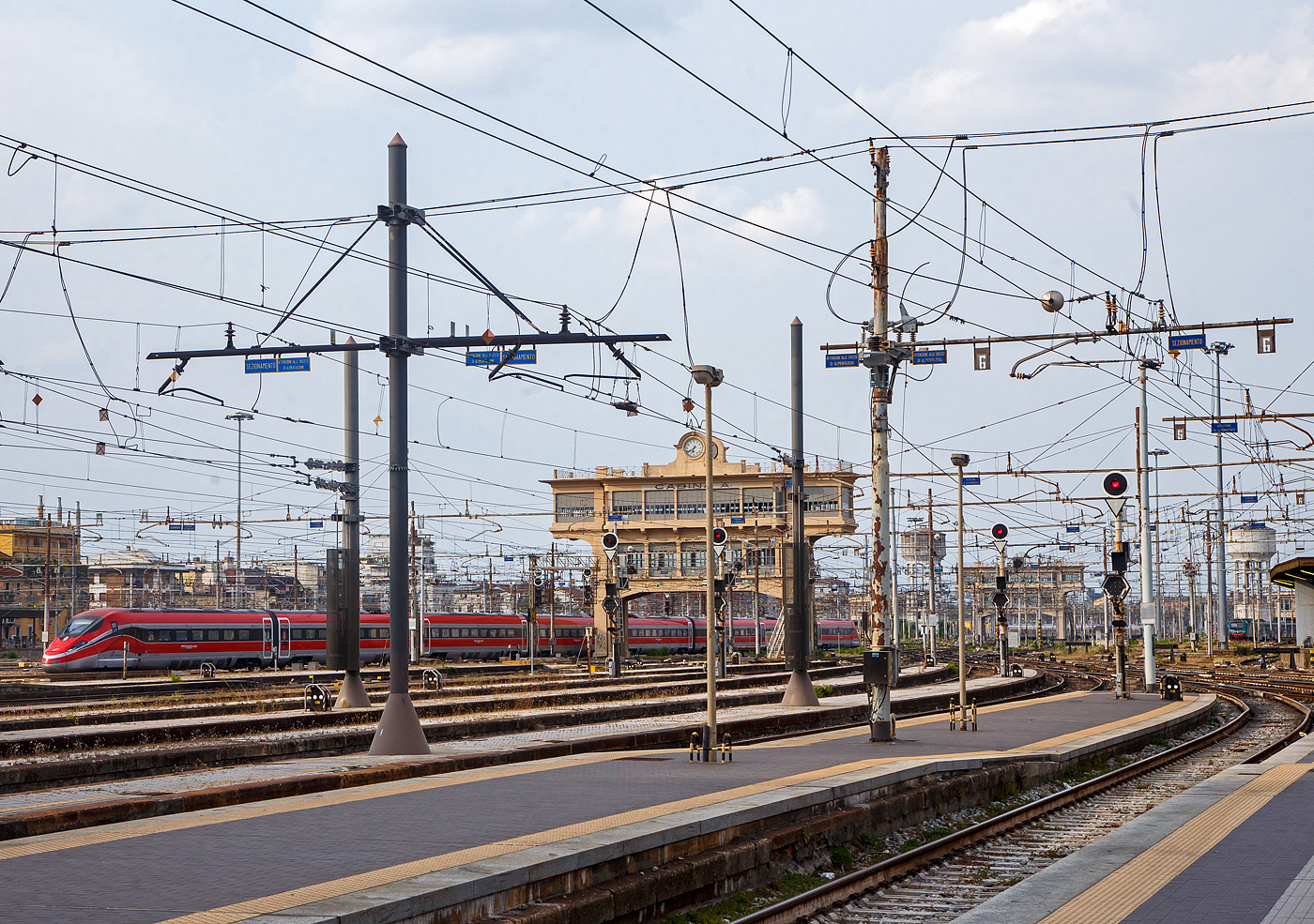 Ausfahrt eines sehr langen "Frecciarossa" (deutsch: roter Pfeil) der Trenitalia (100-prozentige Tochtergesellschaft der Ferrovie dello Stato) am 29.12.2015 vom Bahnhof Milano Centrale (Mailand Zentral). Der Frecciarossa ist eine Zuggattung für Züge mit einer Höchstgeschwindigkeit von 300 km/h. Hier ist es der ETR 500 - 56 ein ETR 500 der 2.Serie. ETR steht ElettroTreno Rapido.