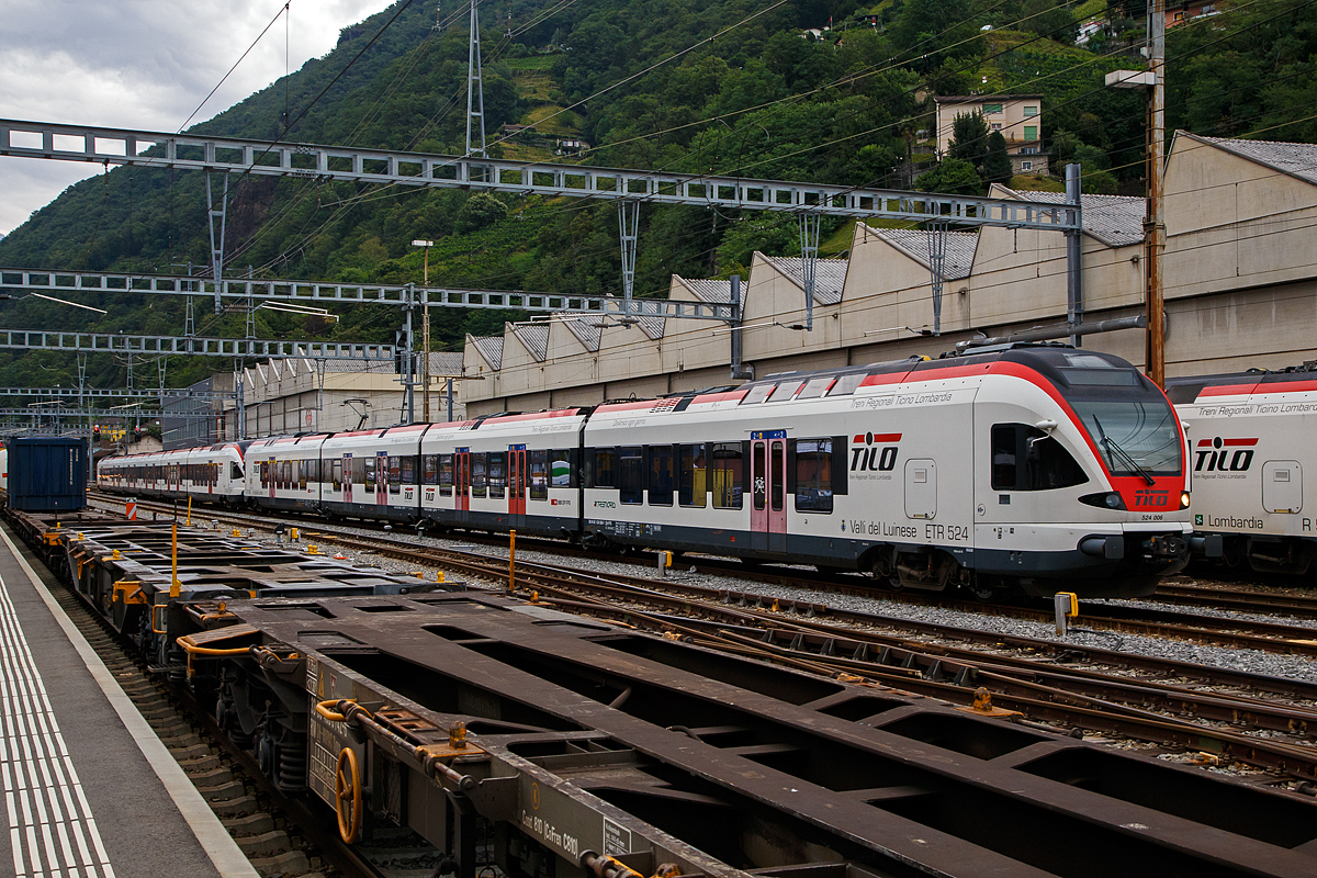 Der vierteilige Stadler FLIRT RABe 524 006 / ETR 524 006 „Valli del Luinese“ und weitere der TiLo (Treni Regionali Ticino Lombardia) stehen am 02.08.2019 beim Bahnhof Bellinzona.