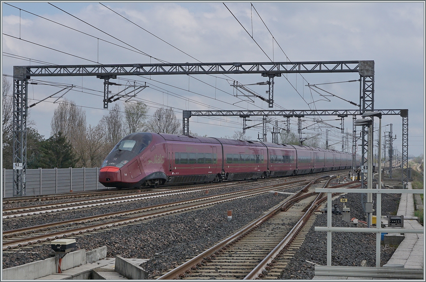 Der ".italo" 09 ein ETR 575 (bzw. Alstom AGV) der NTV (Nuovo Trasporto Viaggiatori) steht am 30.12.2015 im Bahnhof Milano Centrale (Mailand Zentral), als AV 9903, zur Abfahrt nach Napoli Centrale bereit. Um 7:40 Uhr (in einer Minute) ist Abfahrt.