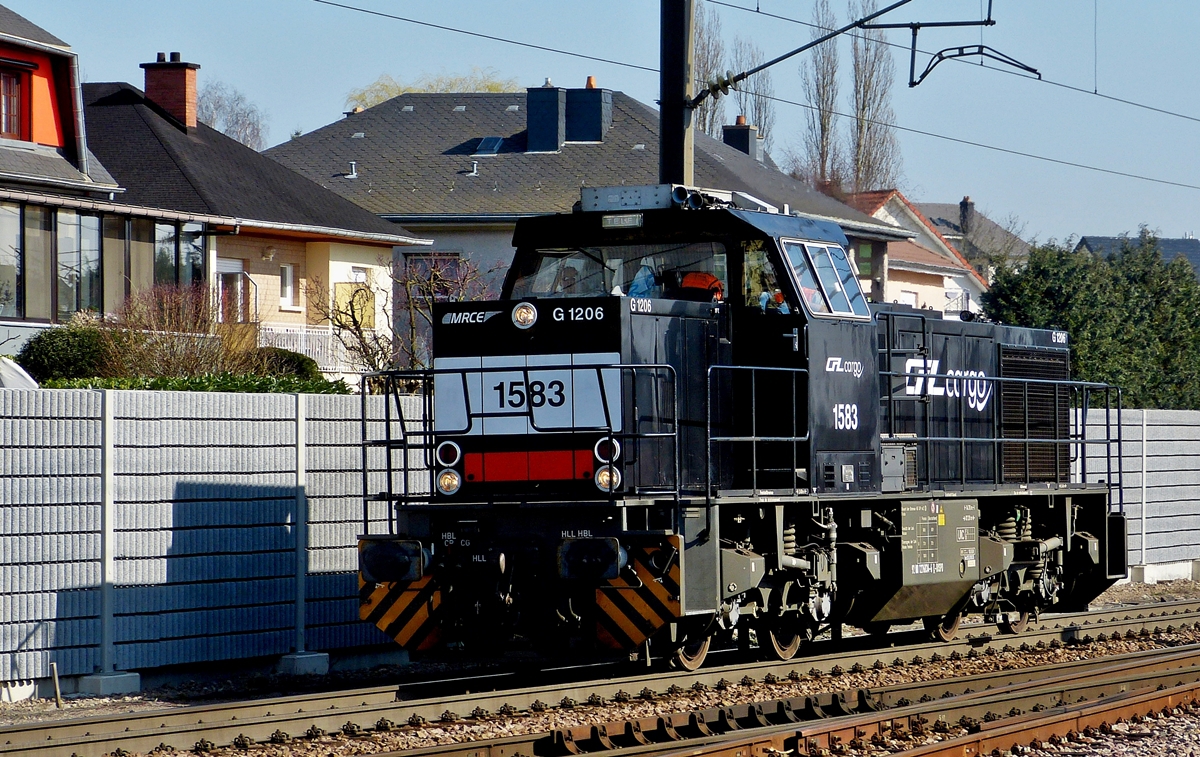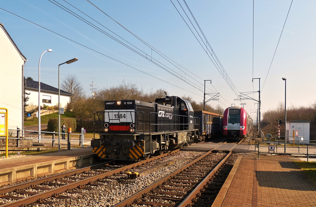 . Die CFL Cargo 1583 fährt am 11.03.2014 solo über den Bahnübergang in Noertzange Richtung Schifflange. (Hans)