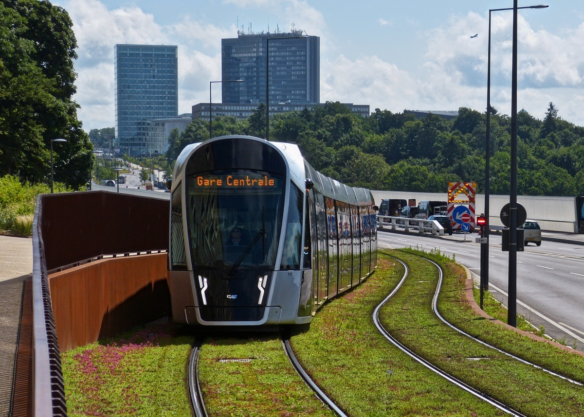 Straßenbahn 115, fährt vom Kirchberg her kommend am Theater vorbei in Richtung Hauptbahnhof der Stadt Luxemburg. 07.07.2021