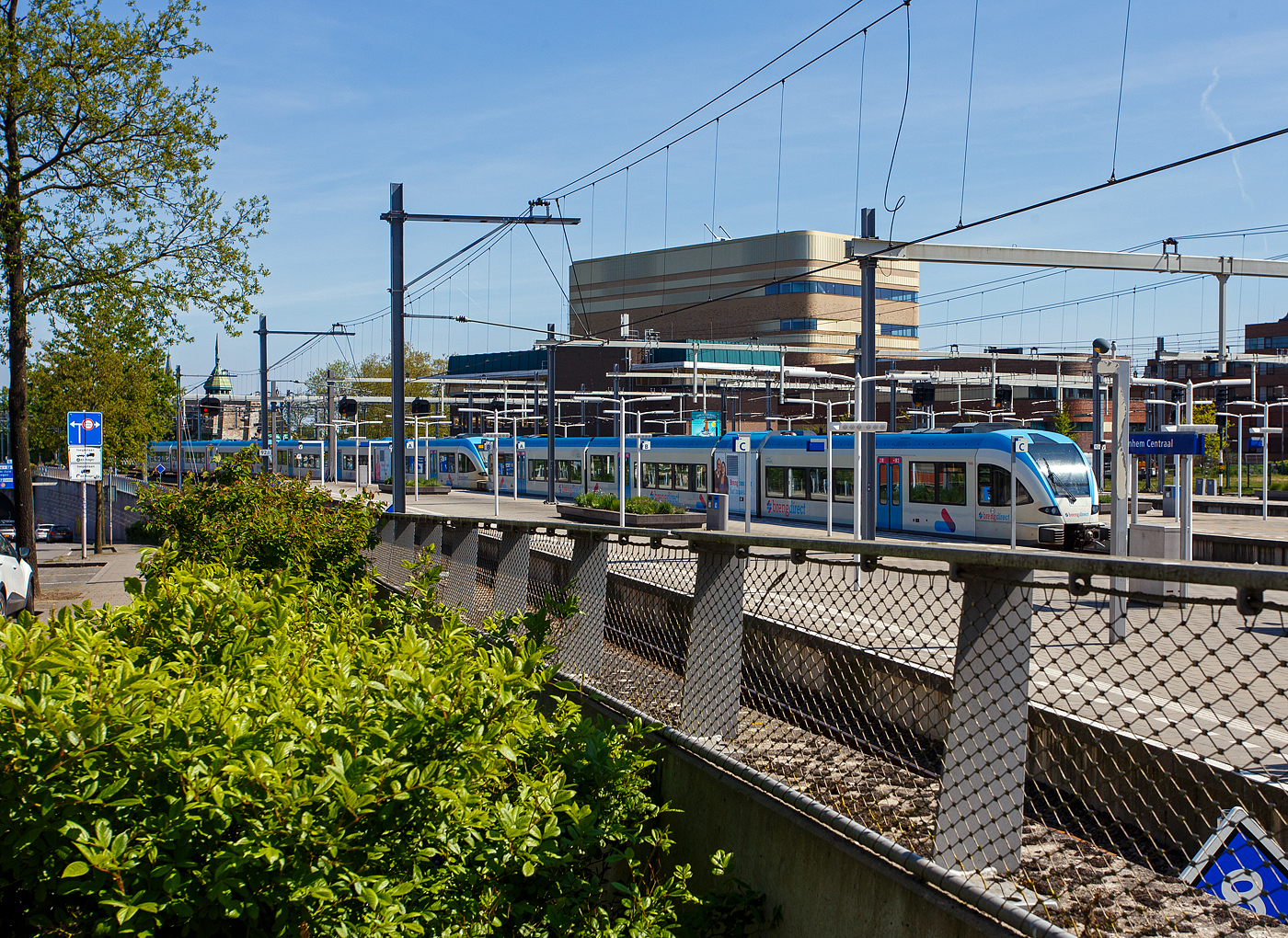 Zwei gekuppelte dreiteilige NS Stadler FLIRT³ (Triebzug 2222 und 2223) der Nederlandse Spoorwegen N.V. (Niederländische Eisenbahnen AG), stehen am 29 April 2025, als Sprinter via Nijmegen (Nimwegen) nach Wijchen, zur Abfahrt im Bahnhof Arnhem Centraal (Arnheim Hbf) bereit.