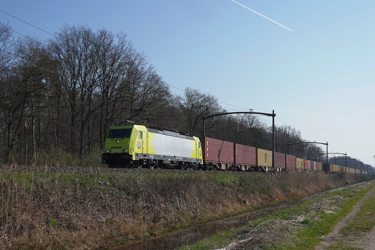 Medway 186 112 glänzt am 18 März 2026 beim Passage durch Tilburg Oude Warande mit ein KLV nach Antwerpen.
