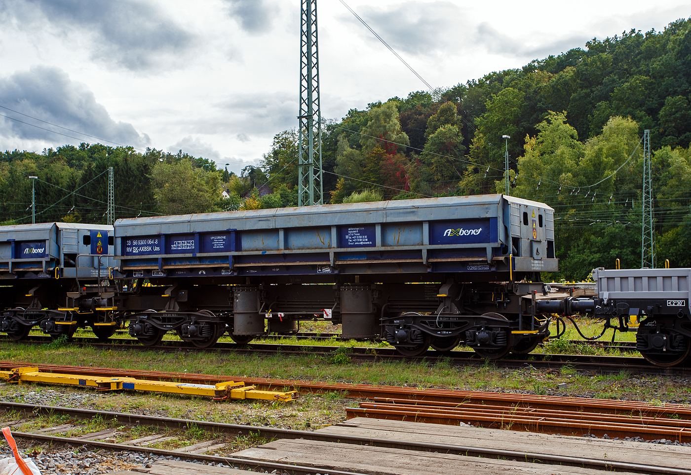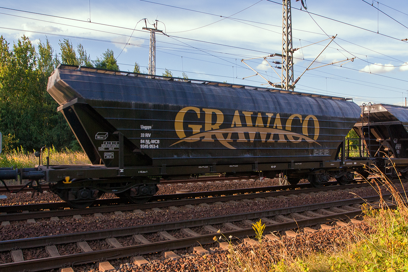 4-achsiger Drehgestell-Großraum-Getreidesilowagen 80 m³, 33 RIV 84 NL-WCB 9345 007-0 [P] der Gattung Uagpps der niederländischen Wagon Care B.V. / GRAWACO am 26 August 20213 im Zugverband bei der Durchfahrt in Pirna.