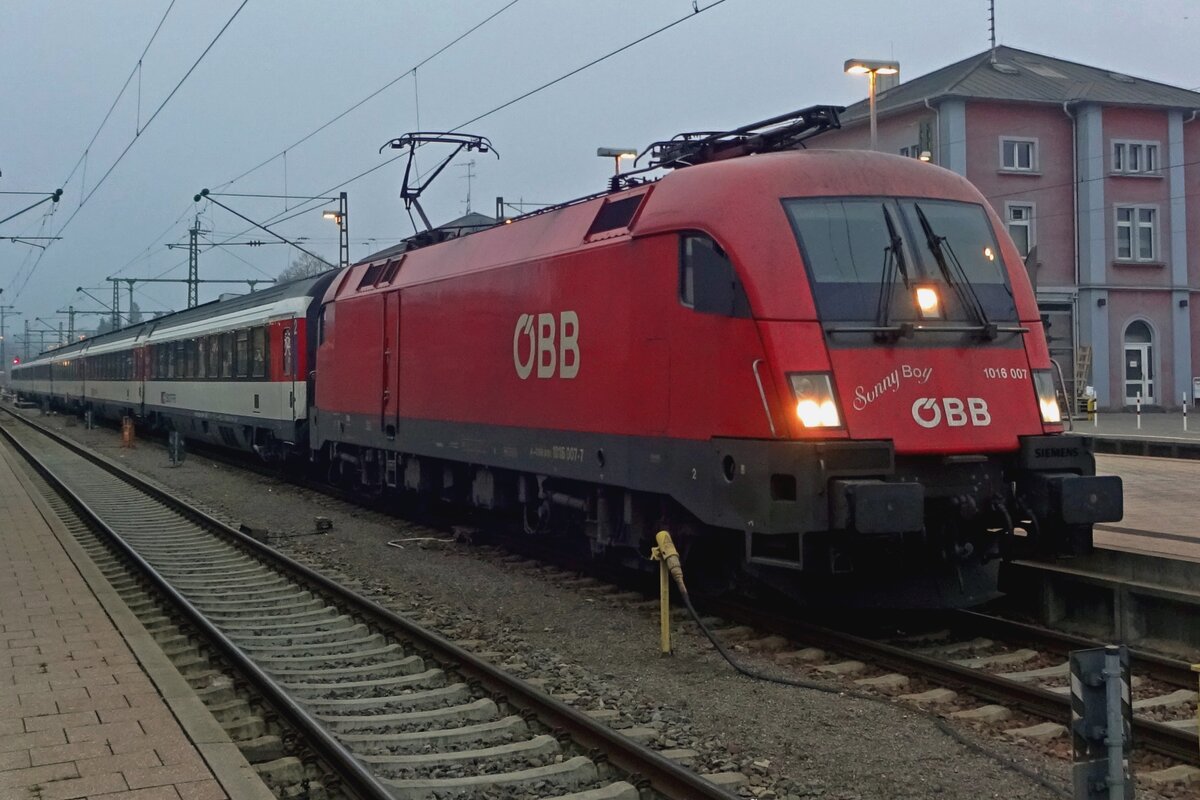 Eine ÖBB Taurus I (ÖBB Reihe 1016 – Siemens ES64U2) fährt am 09 November 2025 mit einem KLV-Zug durch den Bahnhof Betzdorf (Sieg) in Richtung Siegen.
