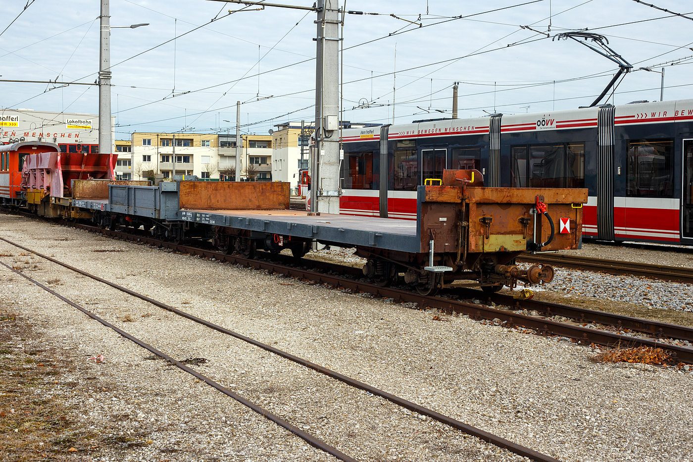 Der meterspurige X 26.641 der Stern & Hafferl Verkehrsgesellschaft m.b.H., ex X 23.641 ehemaliger Turmwagen ELBG - Elektrische Lokalbahn Gmunden (später Straßenbahn Gmunden), ist am 14 Januar 2025 beim Bahnhof Vorchdorf-Eggenberg, ohne Turmaufbau, abgestellt.