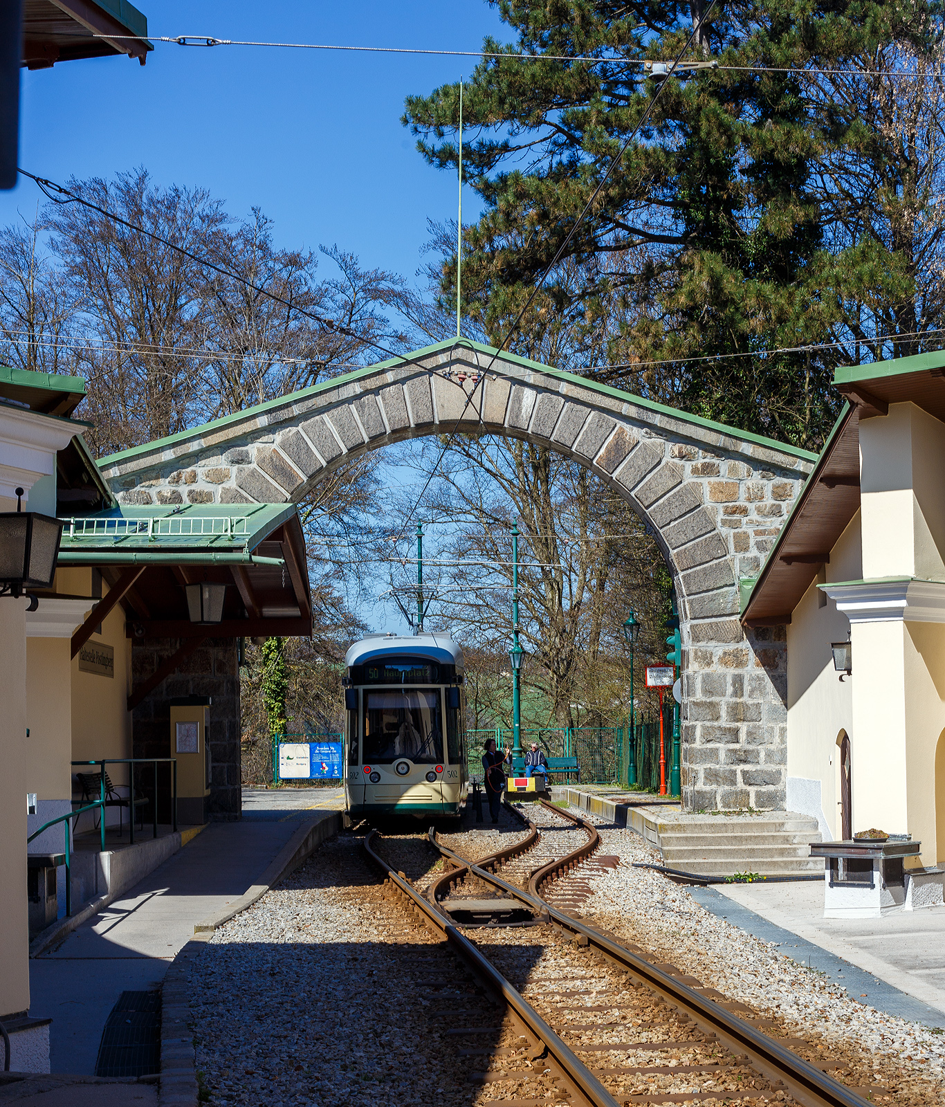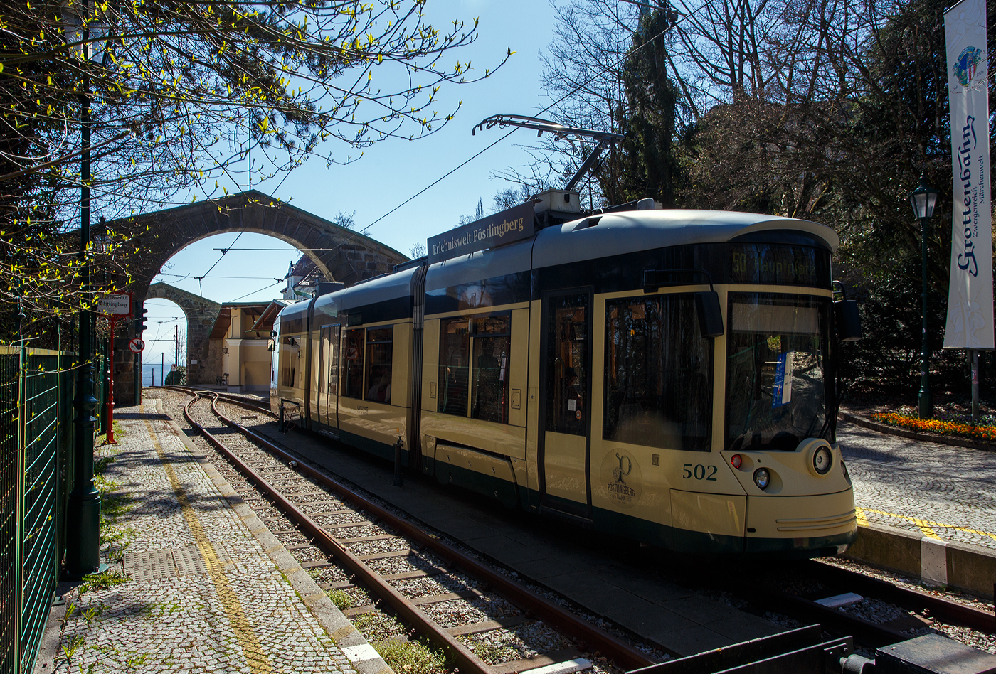 Der Triebwagen 502, ein dreiteiliger vierachsiger Zweirichtungs-Niederflur-Gelenktriebwagen vom Typ Bombardier „Mountainrunner“ erreicht am 04 April 2025 als Linie 50 „Pöstlingberg“ (der Linz Linien GmbH), die Tal-Endstation Linz Hauptplatz und fährt anschießend wieder hinauf zun Pöstlingberg (519 m ü.M).