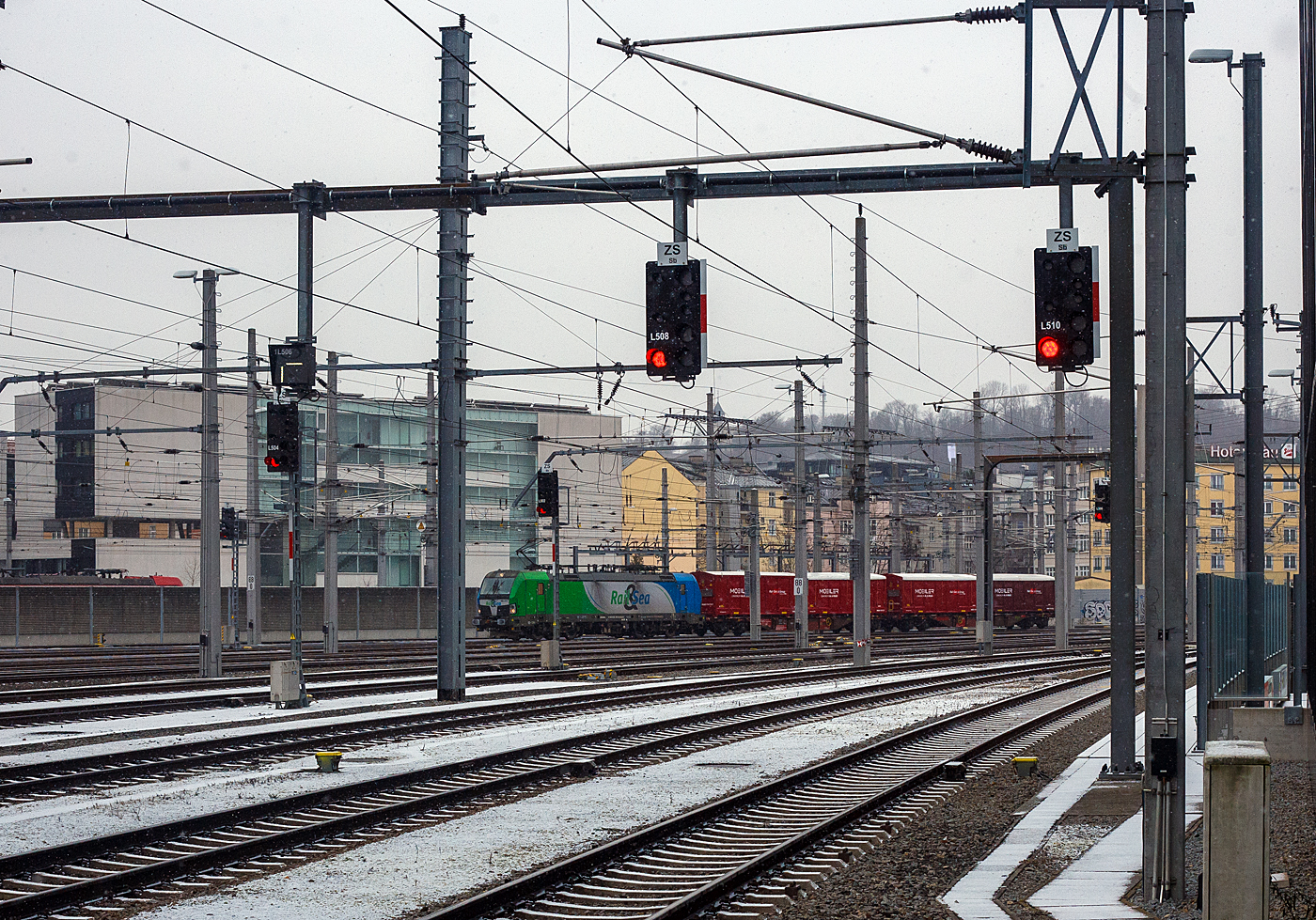 Die für die voestalpine fahrende Siemens Vectron AC 193 250 / 193 - 250 (91 80 6193 250-8 D-ELOC) der ELL Austria GmbH (European Locomotive Leasing, Wien) fährt am 04 April 2025 mit einem Hochbordwagen-Zug (offene Güterwagen der Gattung Eaos) durch den Hauptbahnhof Linz /Donau (A) in Richtung dem Stahlwerk der voestalpine.