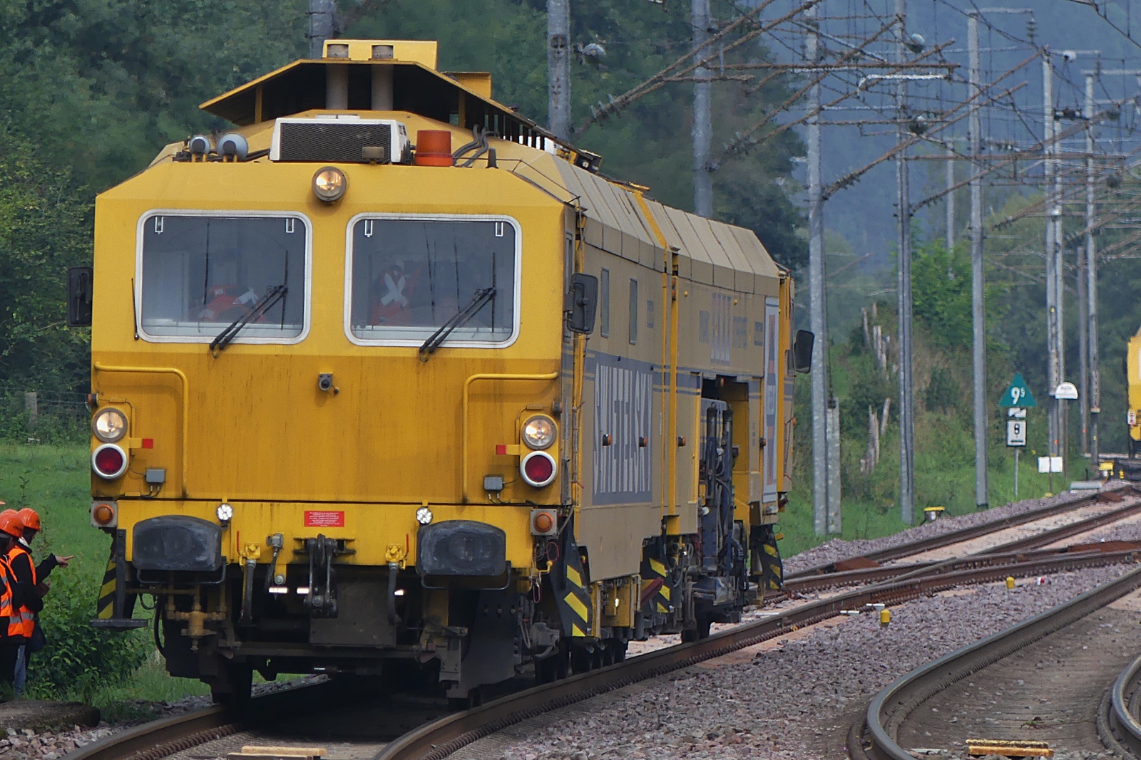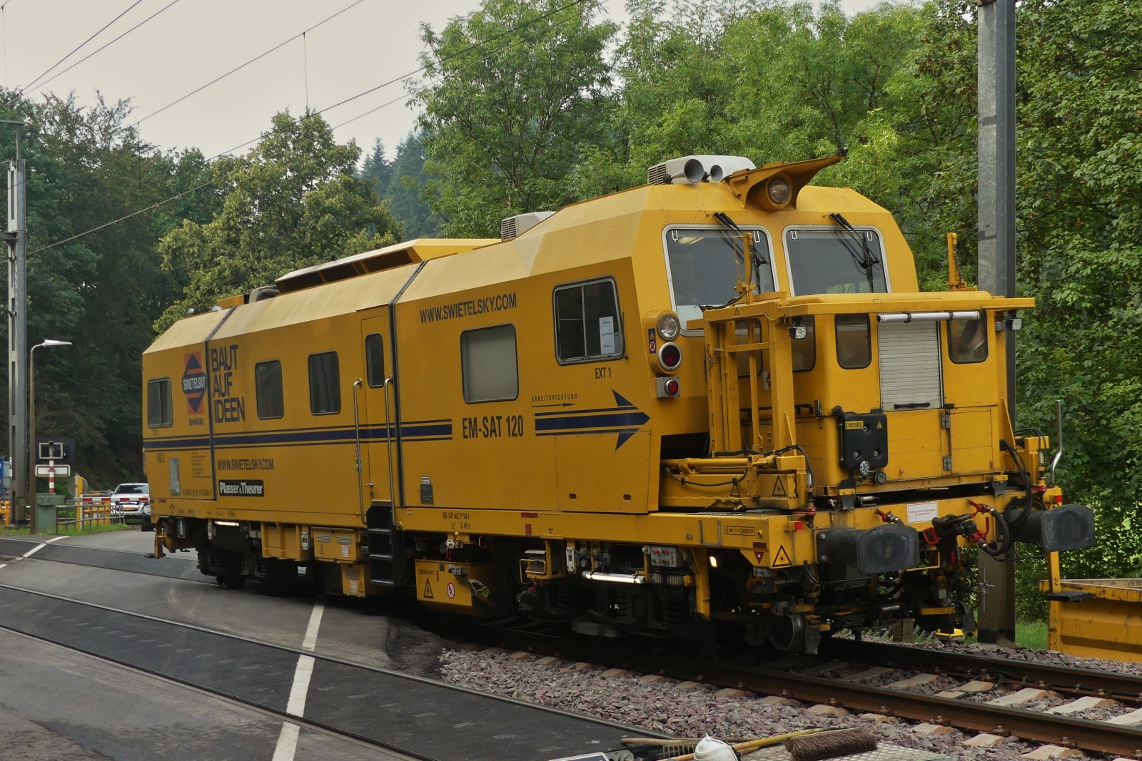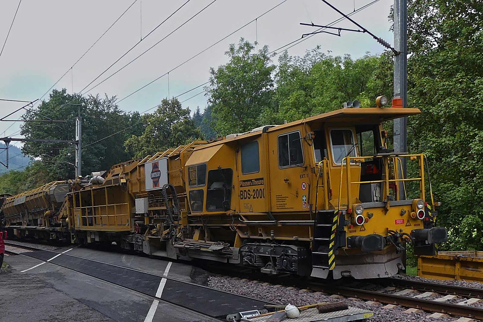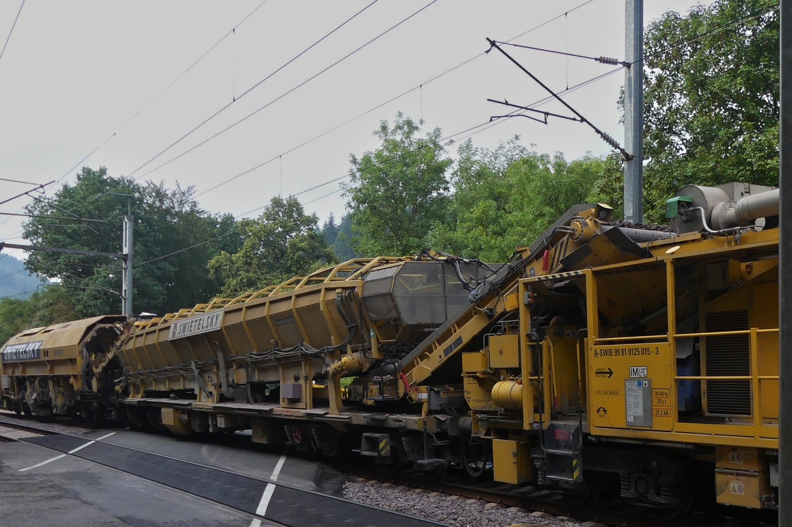 A-SWIE 99 81 9125 014 – 6; Heckansicht des Schweren Nebenfahrzeug Art: Schotterbewirtschaftungssystem BDS 2000 Kehrteil dazwischen ist ein Materialförderer mit Siloeinheit MFS 100 eingereiht, gebaut von Plasser & Theurer im Jahr 2011 im Einsatz für die Gleisbaufirma Swietelsky; Eigengewicht 72,6t; zugelassen für Streckenklasse C 2 und Höher; mak 100 km/h; aufgenommen in der Nähe von Enscherange. 29.08.2023