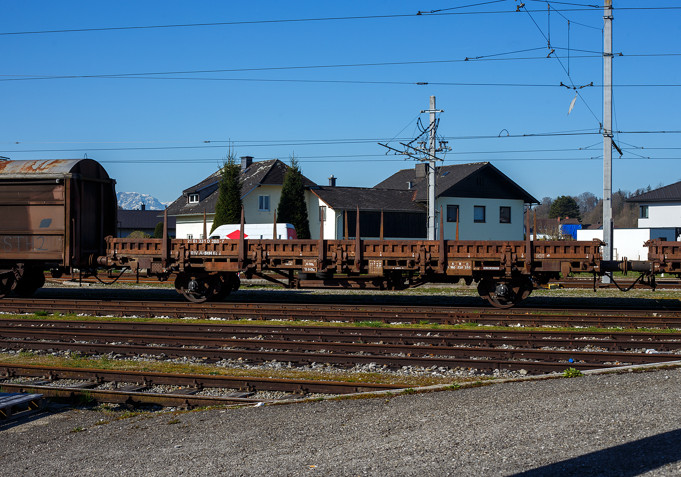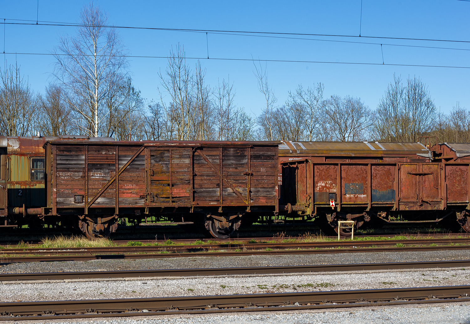 Leider mit einem Mast davor, ein ehemaliger Deutsche Reichsbahn zweiachsiger Güterzugpackwagen der Gattung Pwgs-41, hier letzten ÖBB-Betriebszustand als 40 81 9471 298-5, heute Teil der Sammlung der ÖGEG - Österreichische Gesellschaft für Eisenbahngeschichte GmbH ist am 03. April 2025 beim Bahnhof Timelkam abgestellt und wartet auf eine Aufarbeitung.