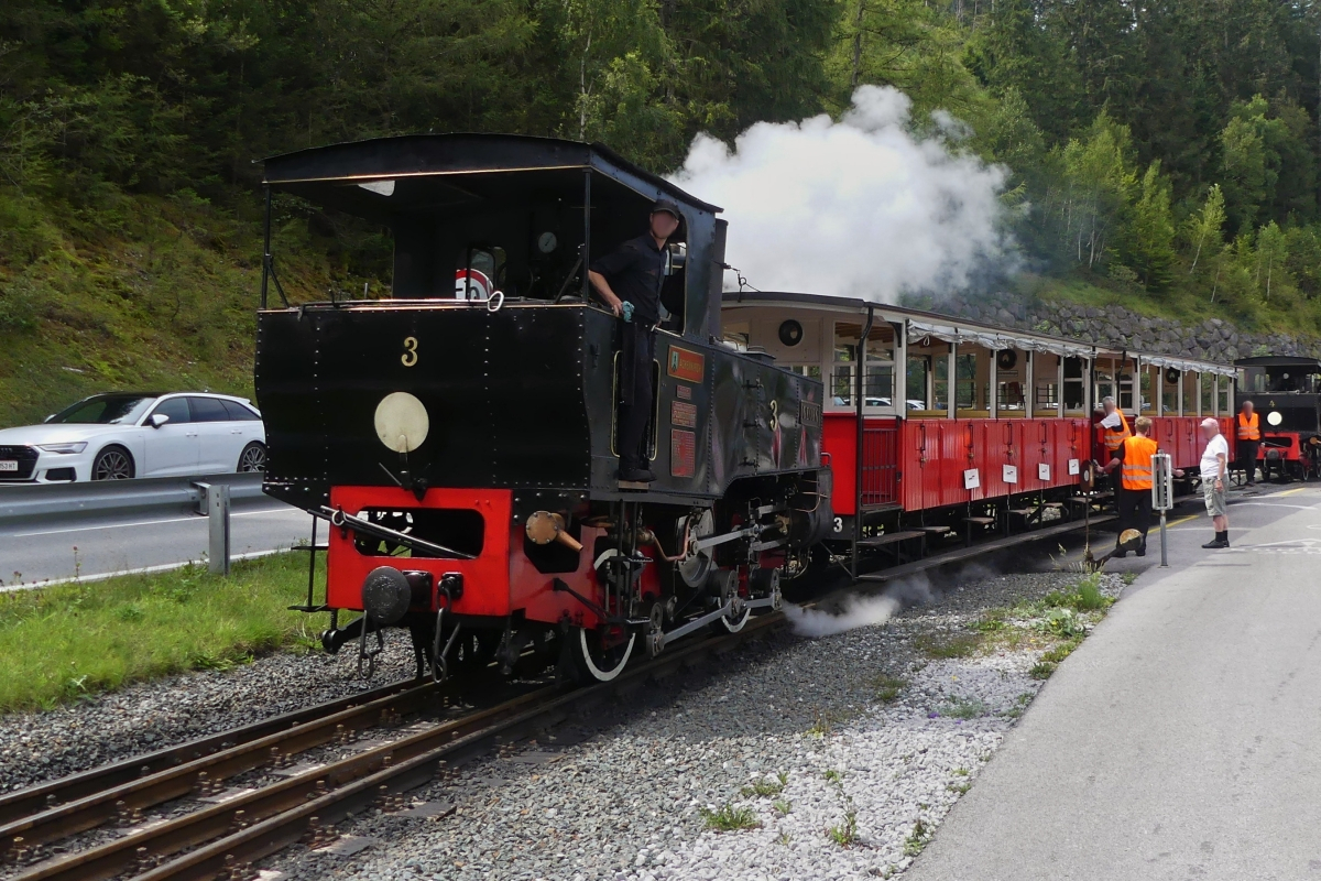 Während Dampflok 4 der Achenseebahn mit ihrem Zug in Richtung Jenbach fährt, schiebt Lok 3 ihren Zug langsam in Richtung Haltestelle Seespitz am Achensee. 22.08.2024 13.11