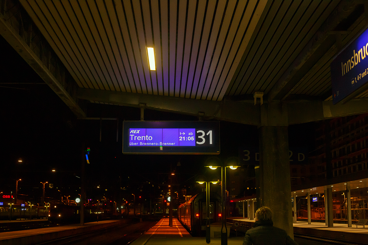 Eigentlich wollten wir von Wörgl bis Innsbruck mit dem ÖBB Railjet (RJX 866 von Wien nach Bregenz) fahren, dieser wurde aber im DB Navigator mit Verspätung angezeigt und dass der REX 1829 nicht warten würde. So nahmen wir in Wörgl gleich den RegionalExpress REX 2 und waren früh genug in Innsbruck Hbf. Später hatte dann doch dieser RegionalExpress (REX 1829) über den Brenner/Brennero nach Trento gewartet. Zum Brenner/Brennero fährt später jeweils um 22, 23 und 0.05 Uhr noch ein Regionalzug, aber nicht weiter in südlicher Richtung.