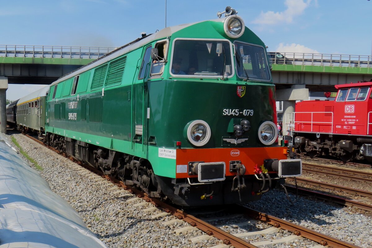 SU45-079 der Klub Sympatykowo Kolej Wroclawu (Wroclawer Klub der Eisenbahnfreunde) verlast Wolsztyn mit ein Sonderzug aus Poznan am 4 Mai 2024.