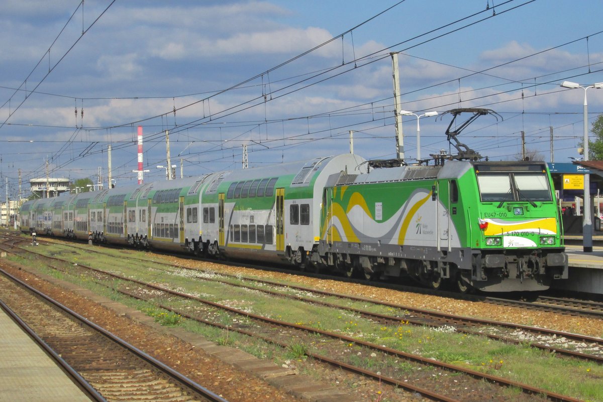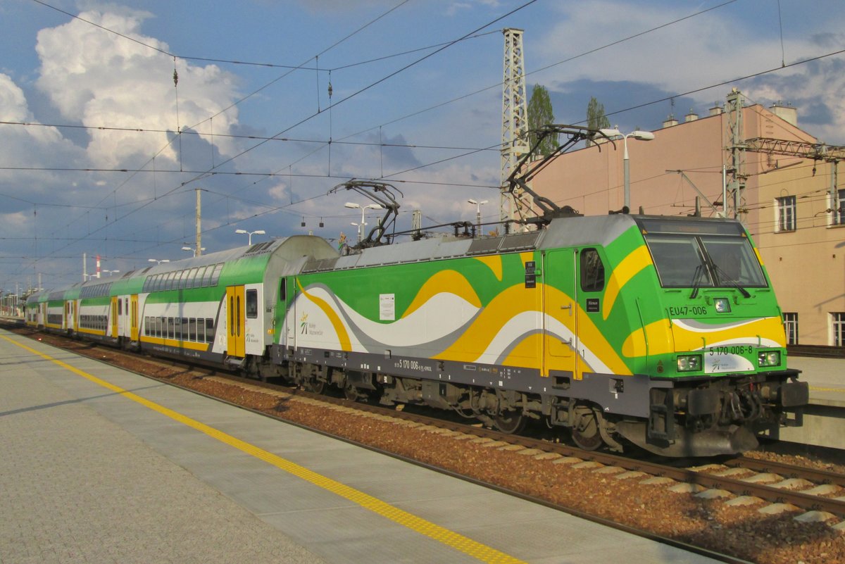 Zwei Züge der KM - Koleje Mazowieckie (Masowische Eisenbahnen) überqueren auf der Most Średnicowy (deutsch: Durchmesserbrücke) in Warschau am 26 Juni 2017 die Weichsel. Vorne ein vierteiliger PESA „Elf“ der Baureihe 22WE / EN76 der Richtung Osten (nach rechts) fährt, dahinter eine EU47 (Traxx P160 DC) mit Bombardier Doppelstockwagen, die Richtung Westen in die Stadt fährt und bald Warszawa Centralna (Warschau Zentralbahnhof) erreicht. Armin Schwarz