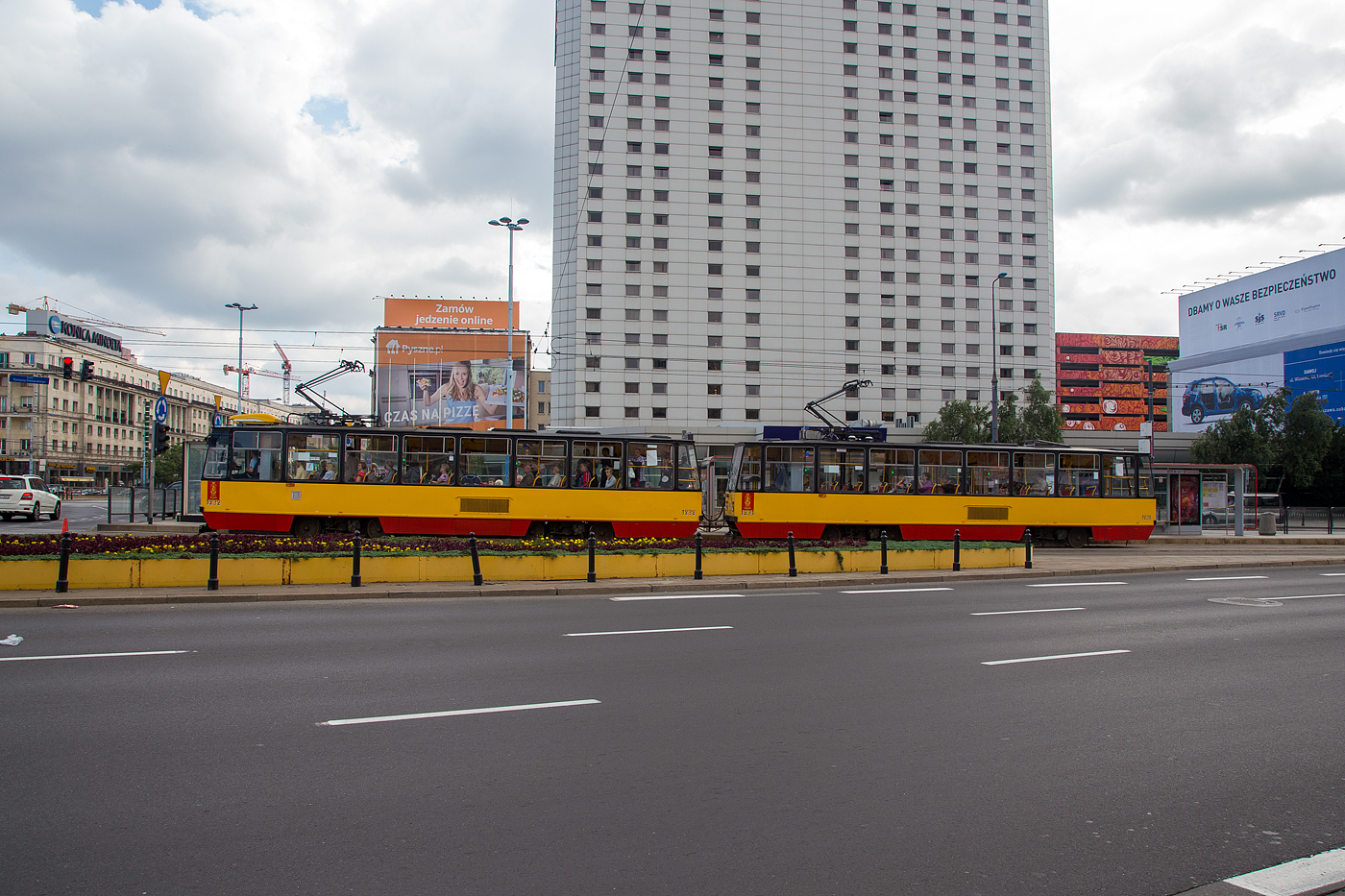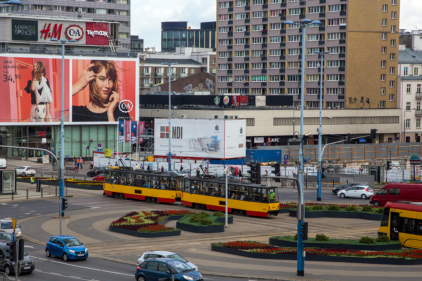 Straßenbahn Warschau (Tramwaje Warszawskie): Zwei Konstal 105Na in Doppeltraktion die Triebwagen 1258 und 1257 am 26 Juni 2017 als Linie 35 bei der Station Centrum, aufgenommen aus unserem Hotelzimmer. Armin Schwarz