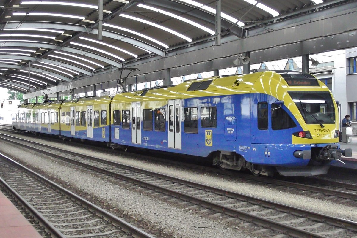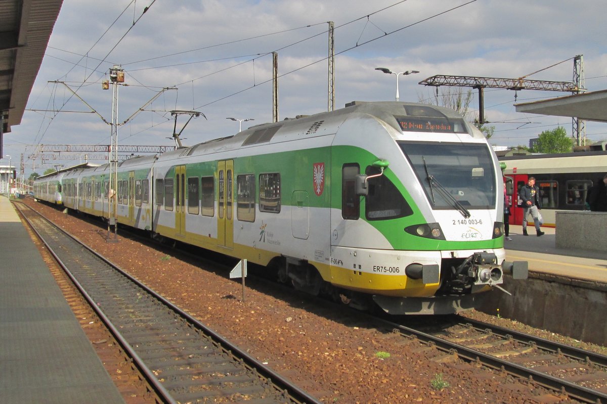 Zwei gekuppelte vierteilige elektrische Triebzüge vom Typ Stadler Flirt ED75 (2 140 xxx-x) der Koleje Mazowieckie - KMKOL (Masowische Eisenbahnen), überqueren auf der Most Średnicowy (deutsch: Durchmesserbrücke) in Warschau am 26 Juni 2017 die Weichsel in Richtung Westen in die Stadt und erreichen bald Warszawa Centralna (Warschau Zentralbahnhof).
