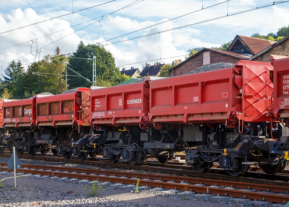 Vierachsiger 86m³ offener Schüttgutwagen (Kohlewagen) mit schlagartiger Schwerkraftentladung und pneumatischer Klappenbetätigung, 33 53 6635 001-5 RO-TOUAX, der Gattung Falns 86 m³, der irländischen Vermietungsfirma TOUAX Rail Limited (in Rumänien eingestellt), eingereiht im Zugverband (gezogen von zwei 182er) bei der Zugdurchfahrt am 18. Juni 2017 durch Koblenz-Lützel in Richtung Süden.
