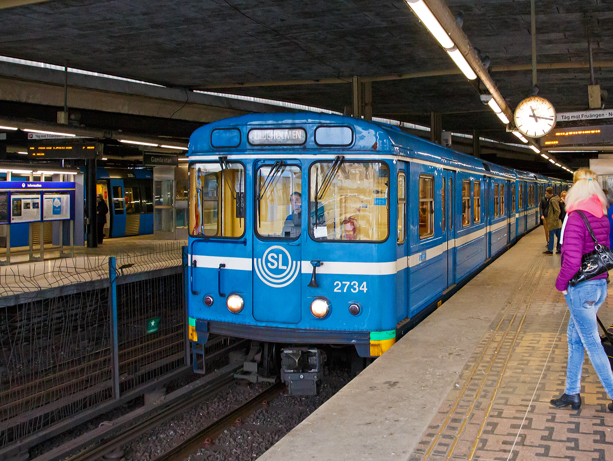 Ein U-Bahn-Zug der bestehend aus drei Triebwagen der SL Baureihe C20 erreicht am 21.03.2019 die Station Gamla Stan.