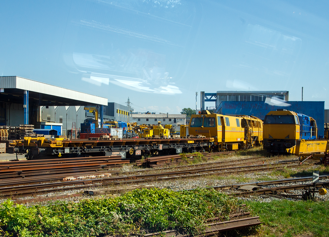 Die Stopfmaschine B66U-5 (VTmaas 80 85 95 81 905-9) der Sersa Group AG steht am 18.05.2018, mit einem angehangen gedeckten Werkstattwagen bei Basel. Aufgenommen aus einem fahrenden ICE.