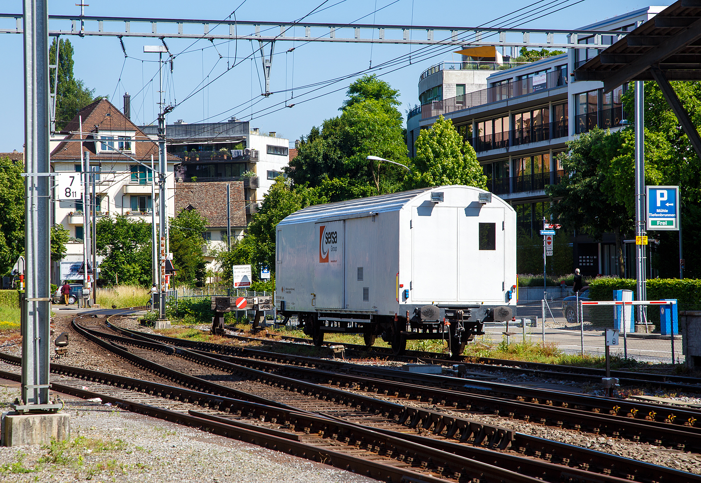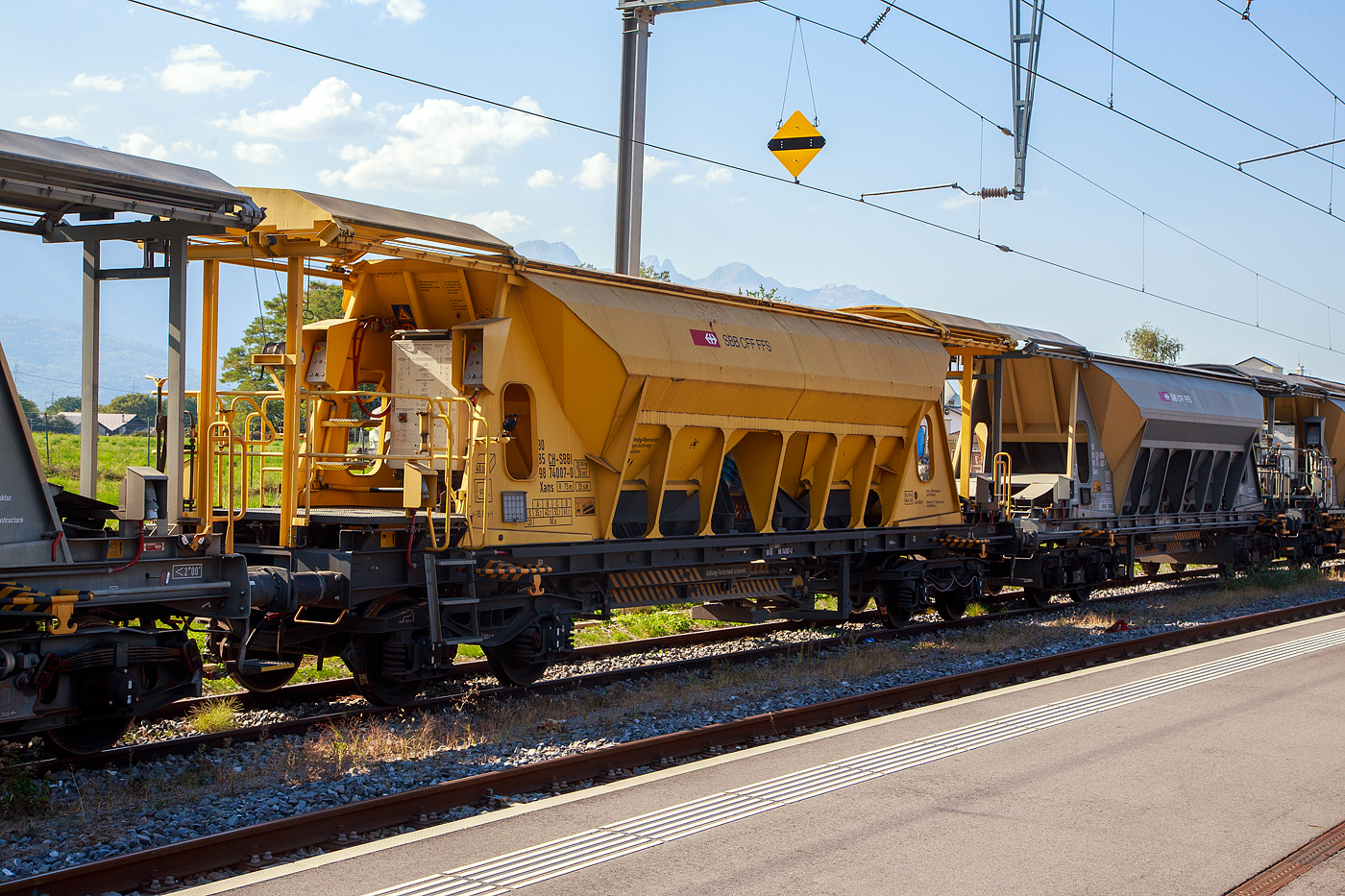 Schneepflugwagen (9592 802-4) der BLS am 02.10.2011 in Interlaken Ost, vor dem Depot der Ballenberg Dampfbahn. Aufnahme aus fahredem Zug.
