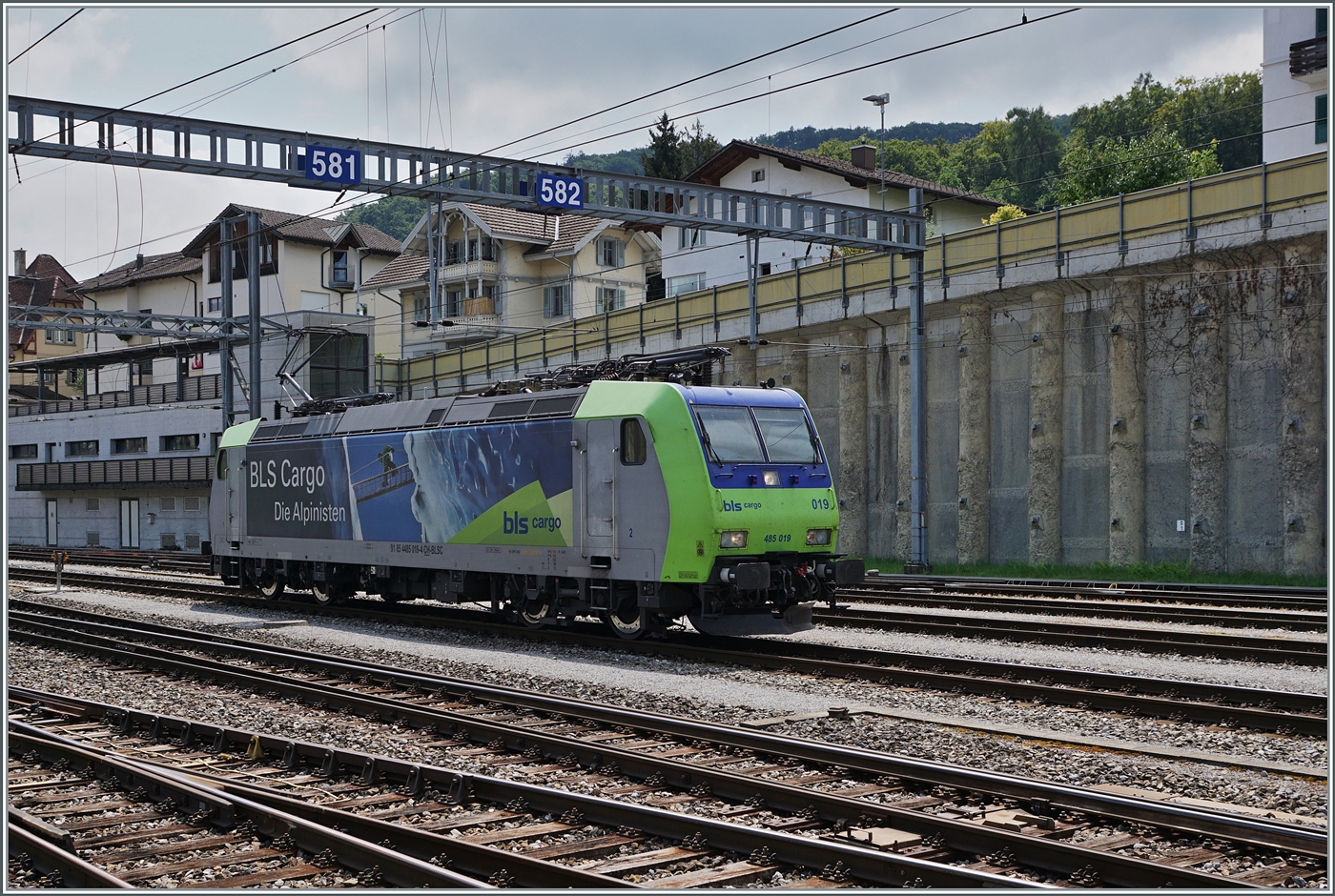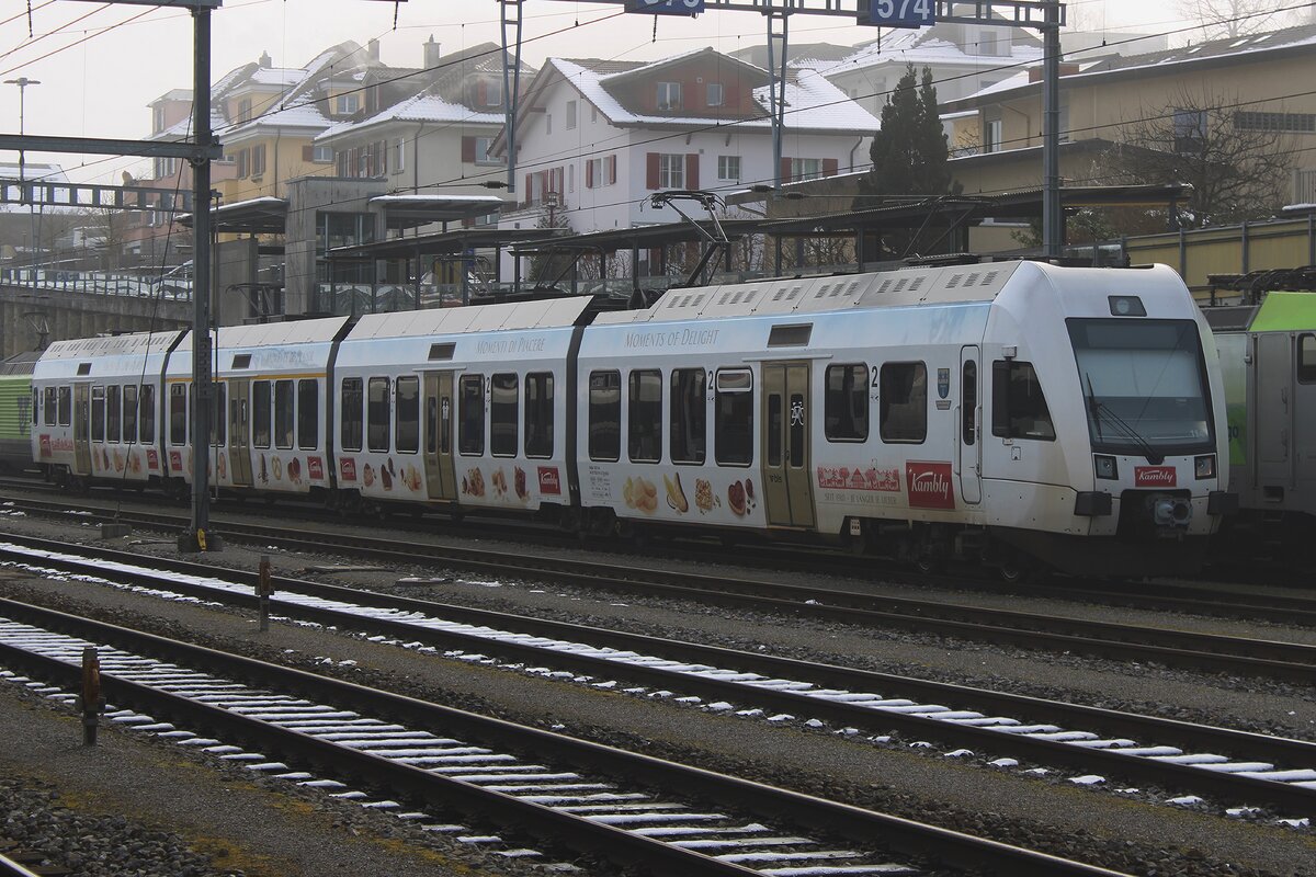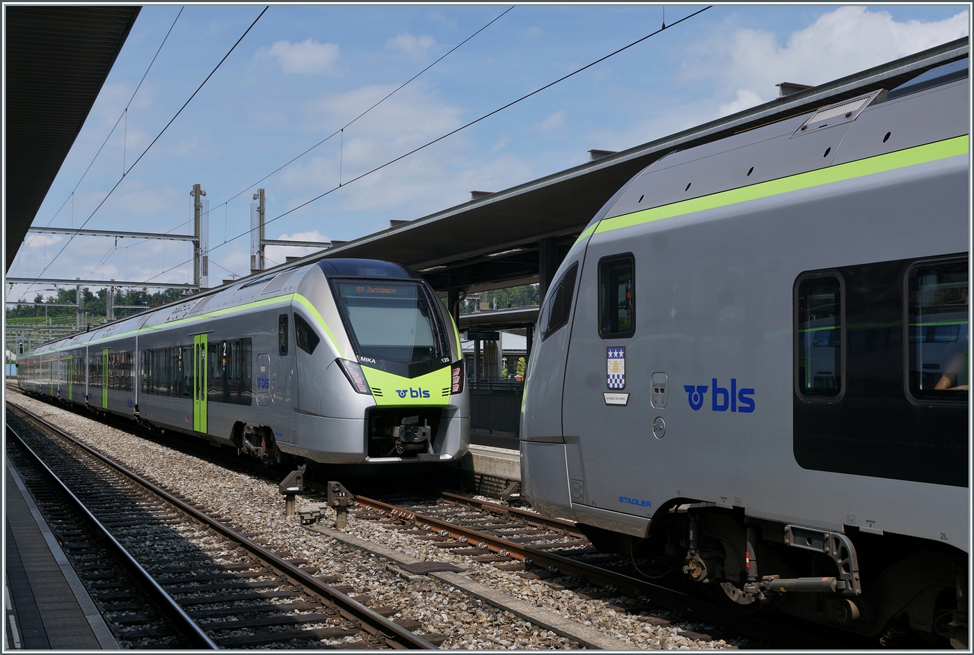 Der BLS RABe 528 119 "Città di Domodossola" auf dem Weg von Bern nach Brig beim Halt (und flügeln) in Spiez.