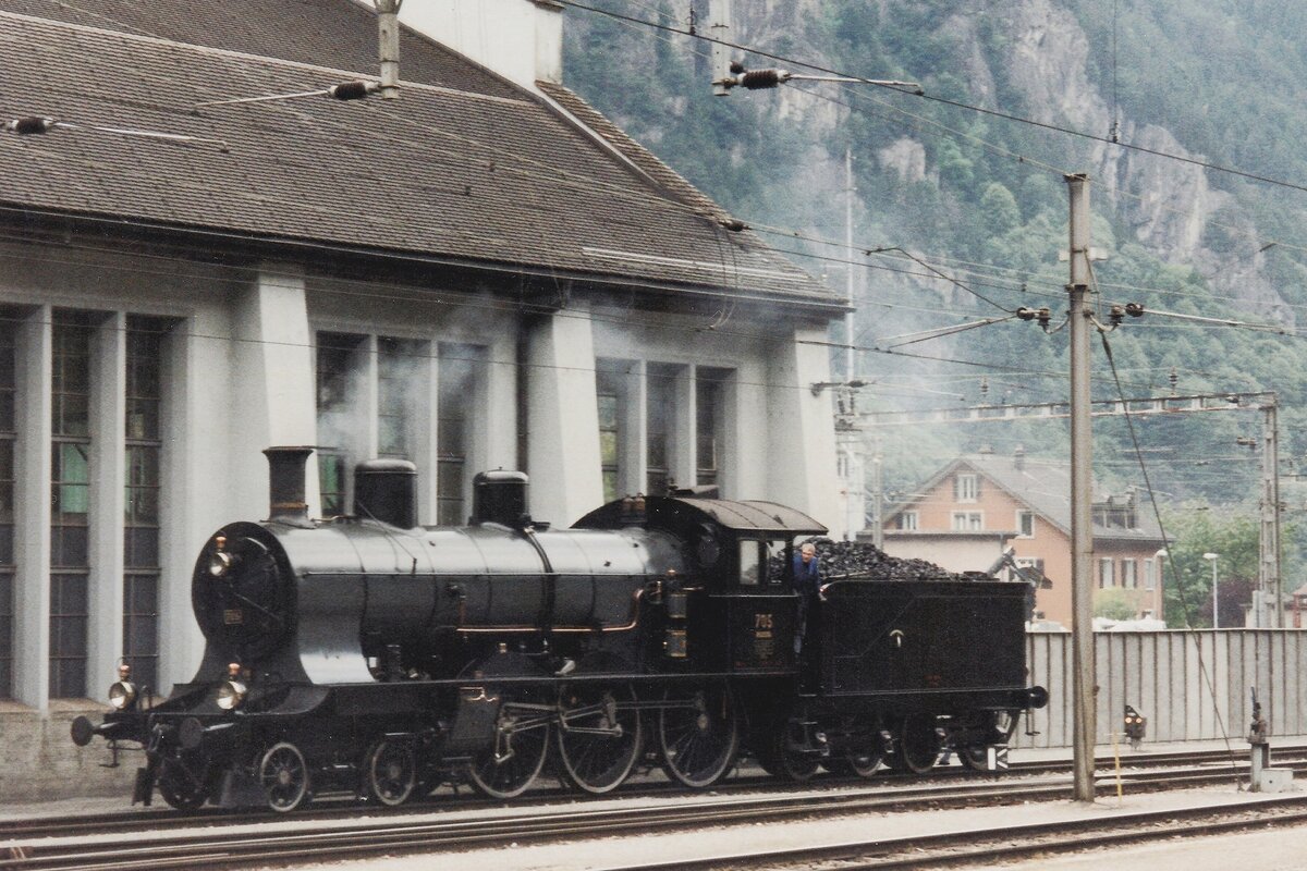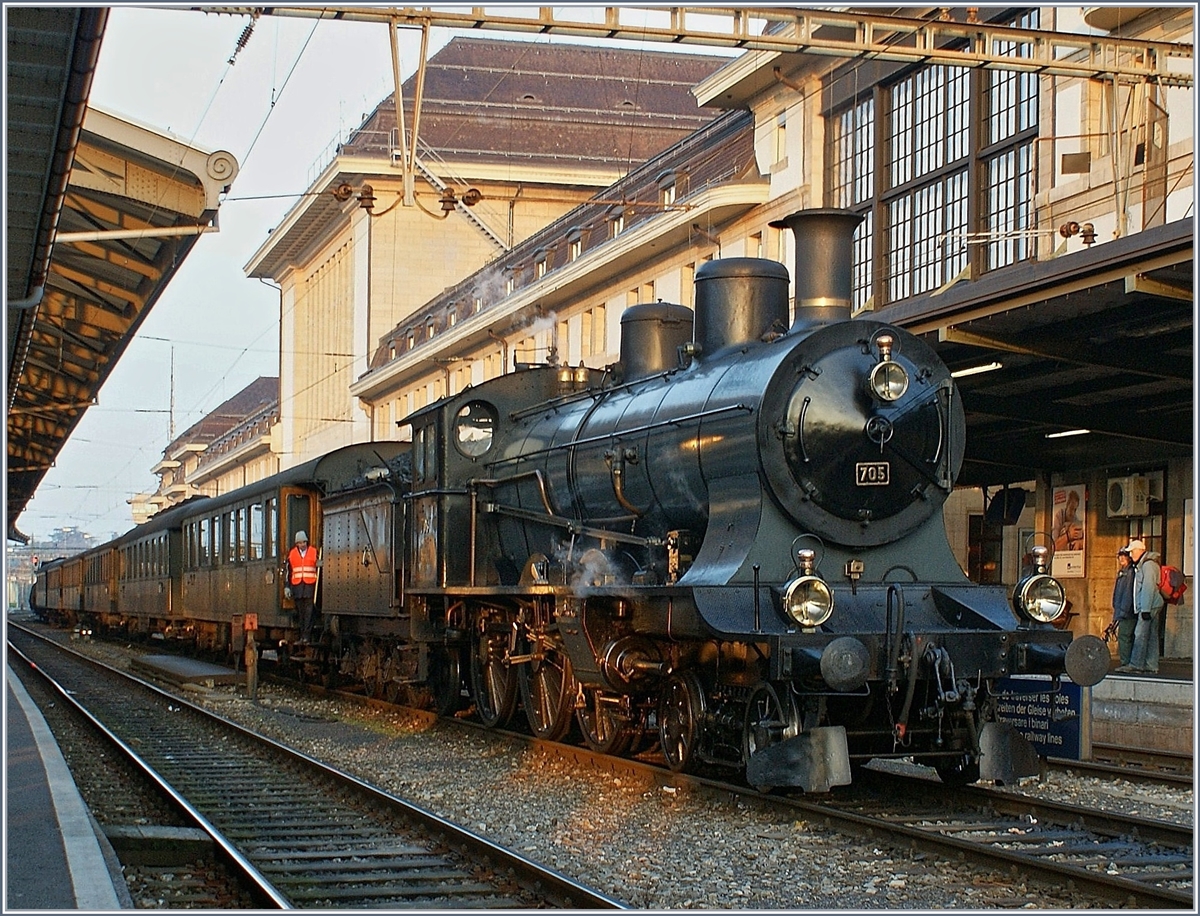 Locomotive à vapeur A 3/5 705 avec les voitures Suisse Trains bleu.