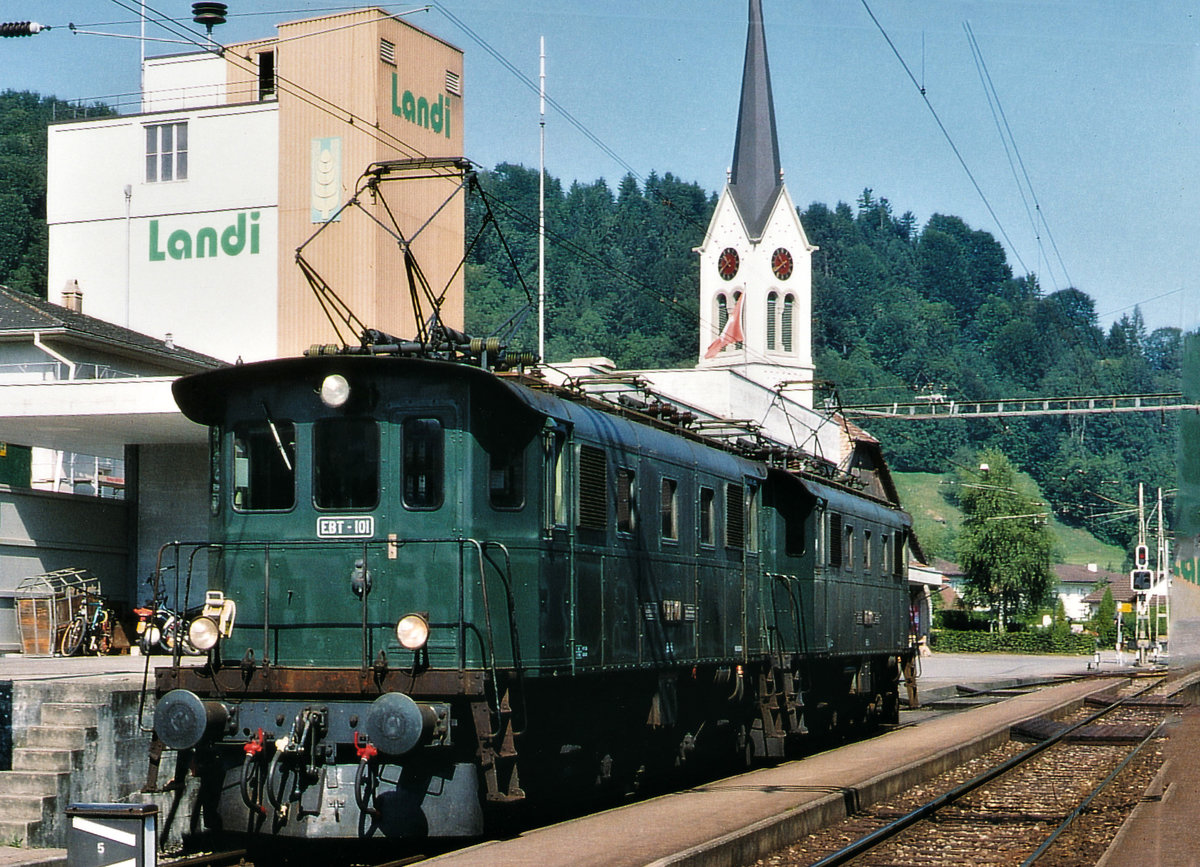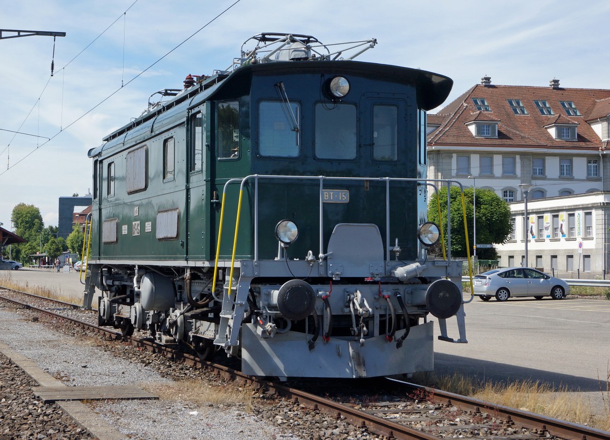 BDWM/DVZO/DBB: Ueber das Wochenende vom 26. bis 28. Juni 2015 verabschiedete sich die BDWM nach 140 Jahren vom Anschluss an das Europäische Normalspurnetz, weil durch die Aufhebung des Güterverkehrs auf normaler und schmaler Spur das Dreischienengeleise zwischen Wohlen und Bremgarten West nutzlos geworden ist. Mit dem WESCHTFÄSCHT und vielen Sonderfahrten nahmen Schüler und eine grosse Anzahl Festbesucher Abschied vom Dreischienengeleise auf diesem reizenden Streckenabschnitt. Am 28. Juni 2015 brachte die DVZO Be 4/4 15, ehemals BT die DBB Eb 3/5 5810 "HABERSACK", ehemals SBB von Wohlen nach Konolfingen zur DBB zurück. Die Aufnahme entstand bei Roggwil im sommerlichen Abendlicht.