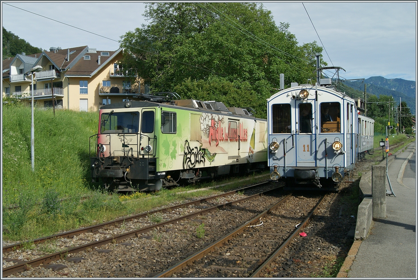 Neben dem CEV Te 2/2 82 gab es noch weiters zu sehen: Da wäre einmal die MOB GDe 4/4 6005, die (leider kaum zu sehn) nun mit einer automatischen Kupplung ausgerüstet ist und im Hintergrund der neue ZAGRO E-MAXI (mit Batterieantrieb) der MOB Werkstättenbereich in Chernex beim Verschub hilft.