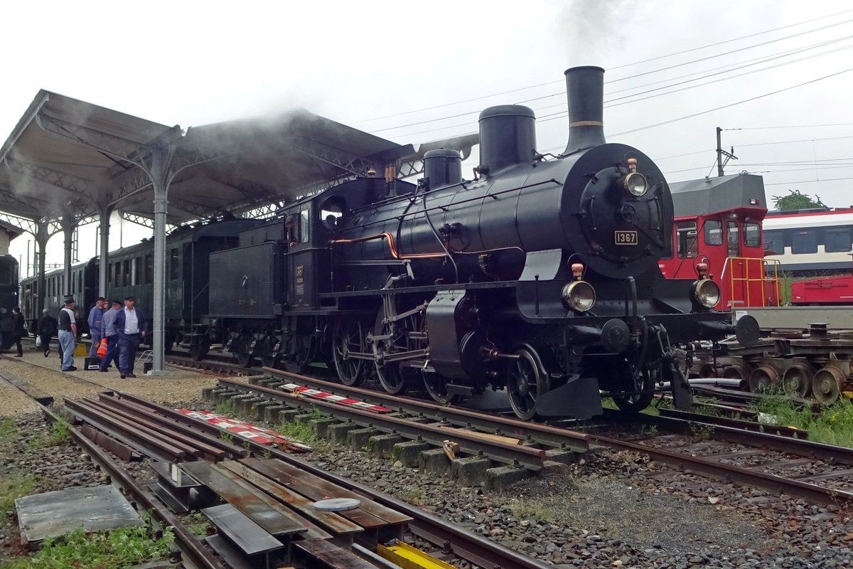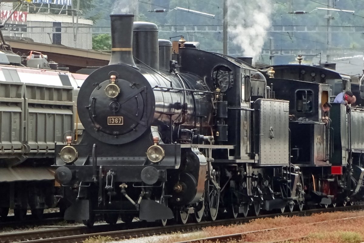 Der Zweck der Rangierfahrt in Göschenen der B 3/4 1367 (SBB Historic) war die Einreihung in den "Dampfzug der Elefanten": die C 5/6 2978 und 2969 fuhren mit einem historischen Zug über den Gotthard und brauchten Hilfe: auf den Nordrampe von der B 3/4 1367 als Schublok am Schluss des Zuges und nun zur Vermeidung von zu viel Rauch im Gotthardtunnel von der SBB Re 4/4 II 11161. Das Bild zeig den in Kürze in Göschenen abfahrenden Zug und auch dass die B 3/4 1367 Vorspanndienst gewohnt ist; ist sie doch hier erst an vierter Stelle eingereiht.