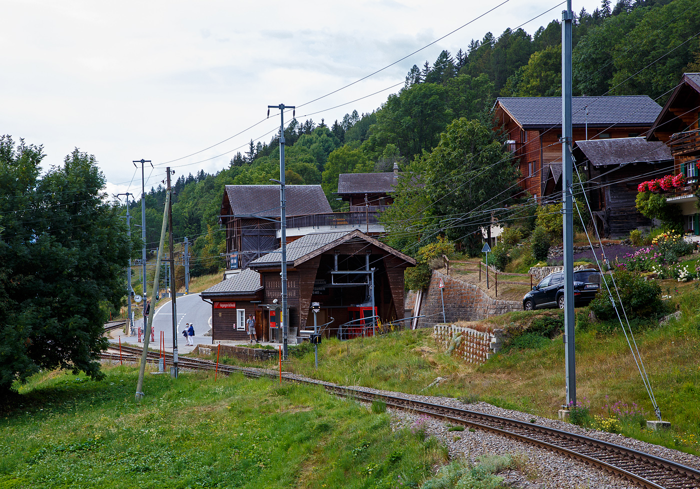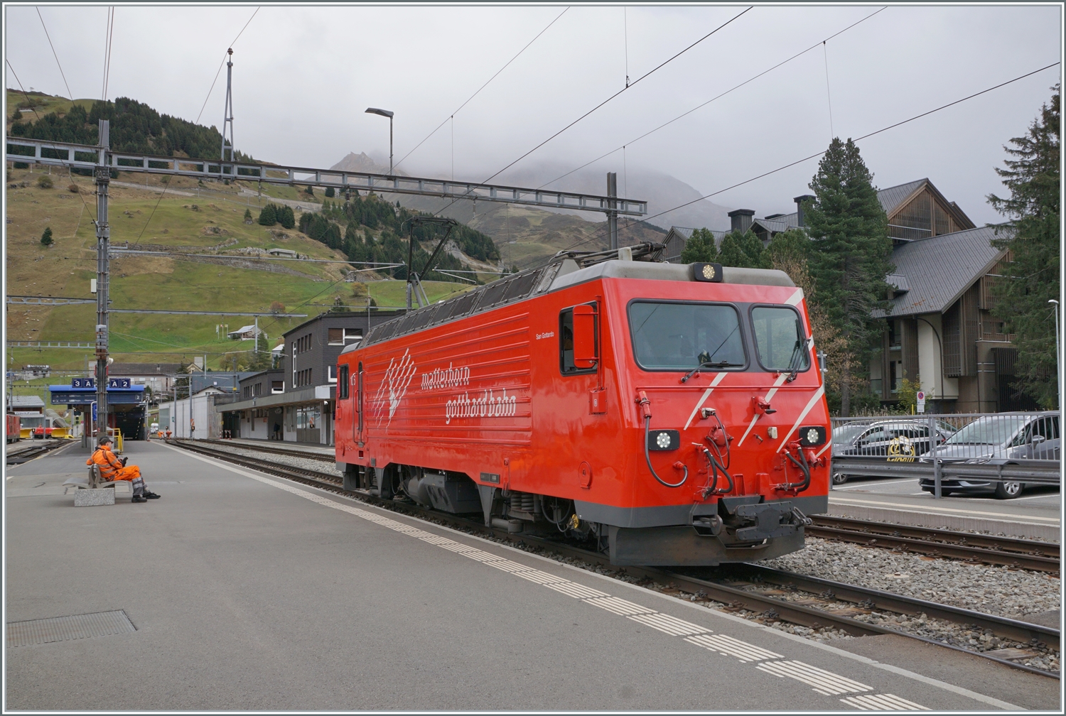 Der MGB Sklv 4806 Rampenwagen (Auffahrwagen) der Matterhorn-Gotthard Bahn, ex FO Sklv 4806 (Furka-Oberalp Bahn), der Serie 4801bis 4806 für den Transport durch den Furka-Basistunnel am 07.09.2021 beim Bahnhof Realp (1.538 m ü. M.), hinter der die MGB Ge 4/4 III - 81 „Wallis“.