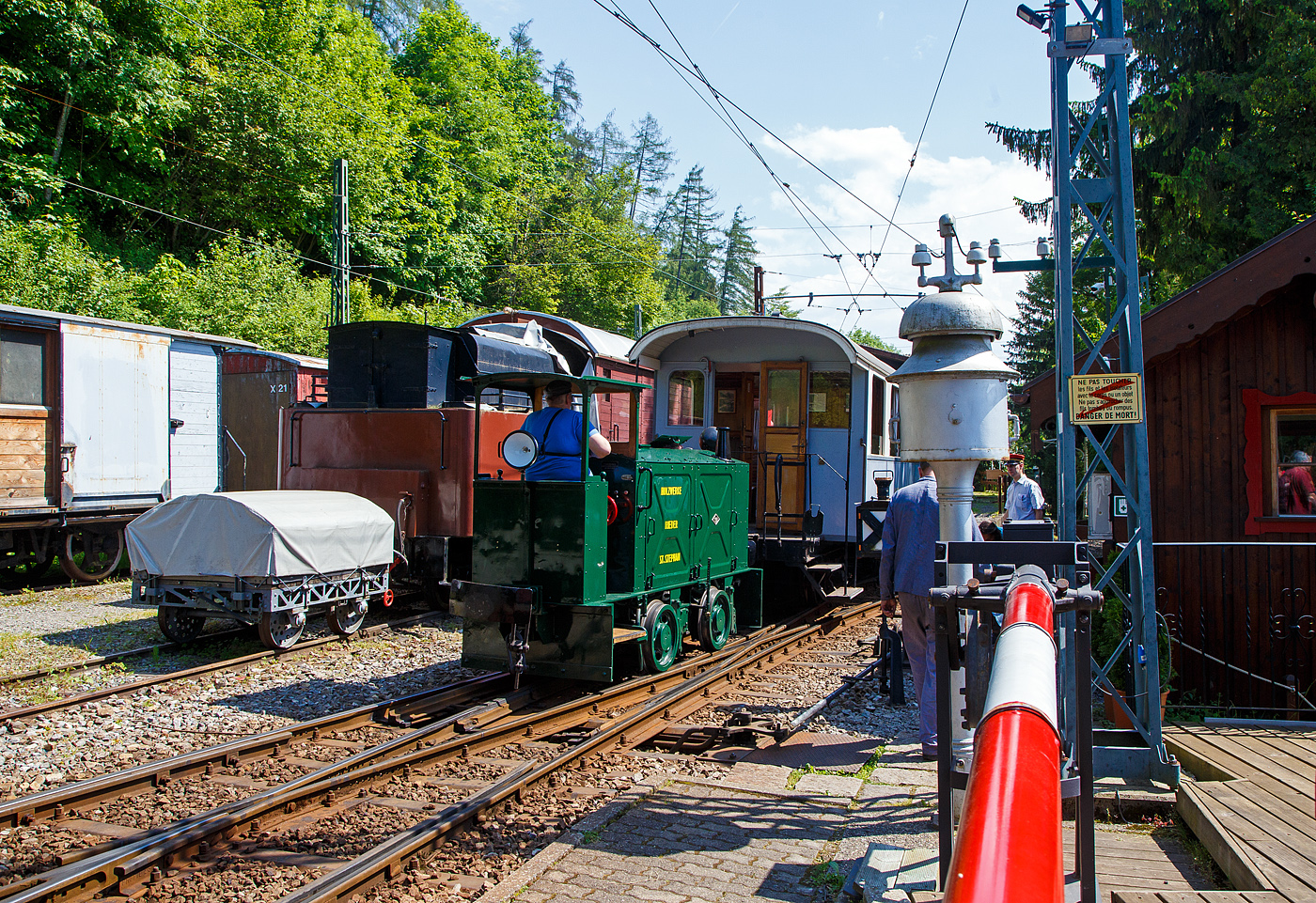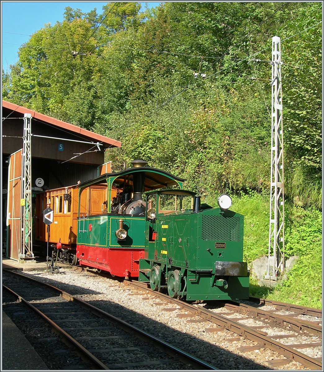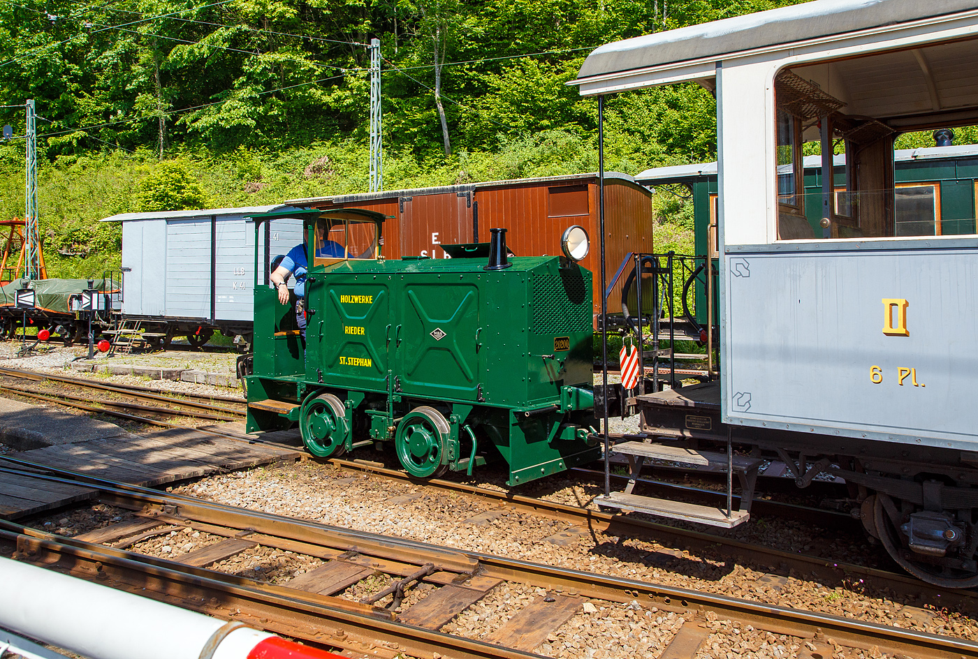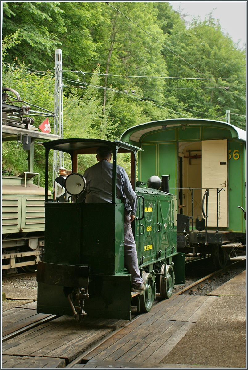 Mit einem 1m³-Wassertank und einer Motorspritze ausgestatte, als Löschzug, der Te 2/2 926 der Museumsbahn Blonay-Chamby, ex VBZ (Verkehrsbetriebe Zürich) Schienentraktor Xe 2/2 – 1926, ex Xe 2/2 – 926, ex StStZ Xe 2/2 – 926, der Museumsbahn Blonay-Chamby am 27.05.2023 im Museum Chaulin. Dahinter der kleine ex MOB Schienentraktor Tm 2/2 Nr. 1, ex Holzwerk Rieder, der Museumsbahn.