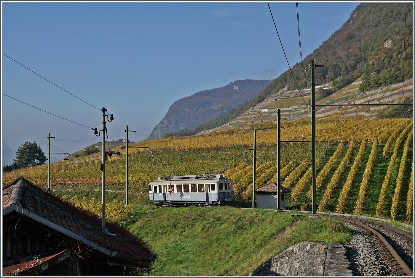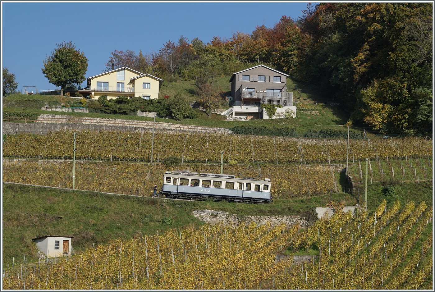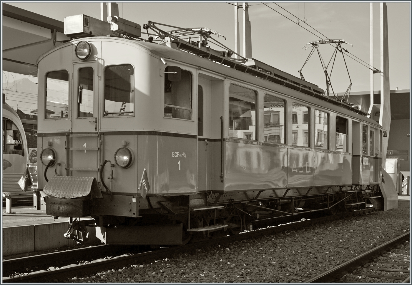 Der elektrische Personentriebwagen mit Gepäckabteil A.S.D. BCFe 4/4 No.1 «TransOrmonan» hat mit dem zweiachsigen 3. Klasse Personenwagen A.S.D. C² 35 am 9 September 2023 den Bahnhof Blonay erreicht, nun wird umgesetzt denn der Triebwagen muss nach vorne.
