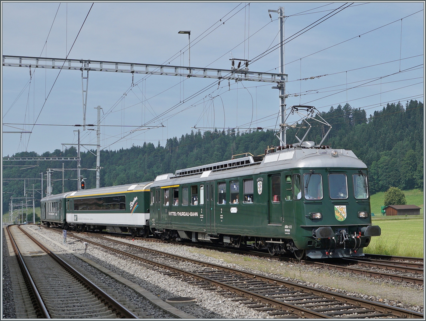 Mit einem Dampfzug der "Emmentalbahn" verlässt die E 3/3 853 (UIC 90 85 0008 573-3) den Bahnhof von Sumiswald-Grünen mit dem Ziel Wasen im Emmental. Im Hintergrund ist der VH-MThB ABe 4/4 N° 12 mit Bodan-Salon-Wagen und dem VH-MThB BDt zu sehen, der vor einer guten halben Stunde Sumiswald erreicht hat.