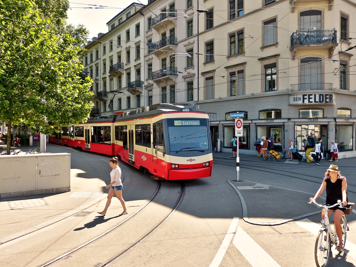 Drei gekuppelte Stadler Be 4/6 (Nr. 62, 67und 68 „Egg“) der Forchbahn stehen am 07.06.2015 am Bahnhof Zürich Stadelhofen, als S18 in Richtung Esslingen, zur Abfahrt bereit.