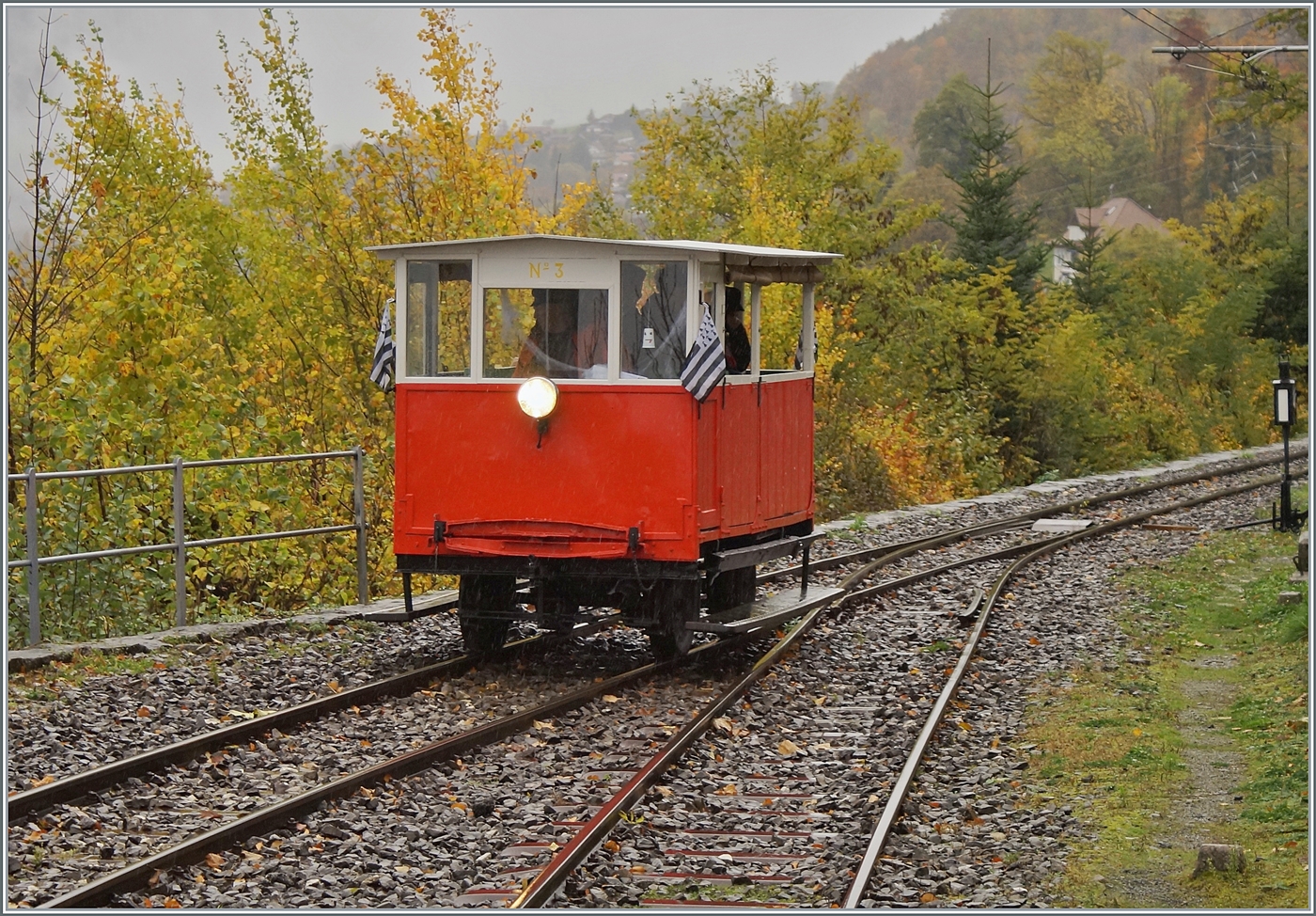Einige Minuten später verlässt der CEV MVR ABeh 2/6 7504 "Vevey" als R 34 2317 auf dem Weg von Les Avants nach Montreux den hübschen Bahnhof von Chamby, der auf 749 müM liegt. Hier liegt kaum noch Schnee.